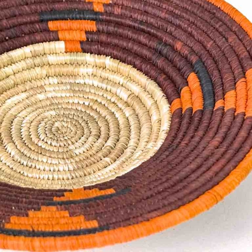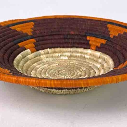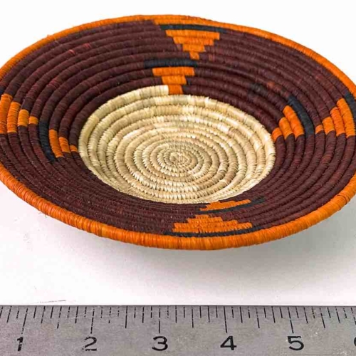 This basket/bowl is one of the thinnest coil and therefore finest quality woven basket in Africa. The design is among the most intricate, demonstrating the very advanced skill of the women who make these in Uganda, near the Ruwenzori Mountains. This one is relatively small which affords the woman who made it to show off her exceptional basket weaving ability at a lower cost. We think these are the most beautiful and finest quality baskets we have ever seen, reflecting the unbelievable ingenuity of these amazing Ugandan artisans. Locally available natural dyes are used to create the vibrant colors which contribute to the beauty of these baskets This basket measures 7 1/8″ in diameter x 1 1/4″ deep.