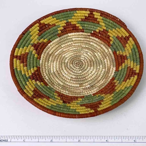 This basket/bowl is one of the thinnest coil and therefore finest quality woven basket in Africa. The design is among the most intricate, demonstrating the very advanced skill of the women who make these in Uganda, near the Ruwenzori Mountains. This one is relatively small which affords the woman who made it to show off her exceptional basket weaving ability at a lower cost. We think these are the most beautiful and finest quality baskets we have ever seen, reflecting the unbelievable ingenuity of these amazing Ugandan artisans. Locally available natural dyes are used to create the vibrant colors which contribute to the beauty of these baskets This basket measures 5 3/8″ in diameter x 5/8″ deep.