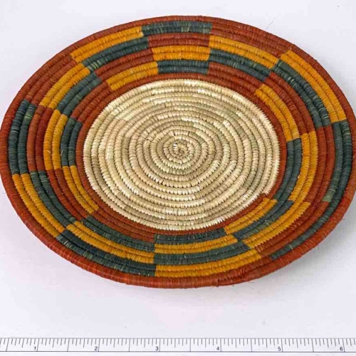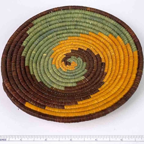 This basket/bowl is one of the thinnest coil and therefore finest quality woven basket in Africa. The design is among the most intricate, demonstrating the very advanced skill of the women who make these in Uganda, near the Ruwenzori Mountains. This one is relatively small which affords the woman who made it to show off her exceptional basket weaving ability at a lower cost. We think these are the most beautiful and finest quality baskets we have ever seen, reflecting the unbelievable ingenuity of these amazing Ugandan artisans. Locally available natural dyes are used to create the vibrant colors which contribute to the beauty of these baskets This basket measures 6 1/4″ in diameter x 7/8″ deep.