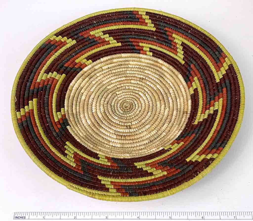 This basket/bowl is one of the thinnest coil and therefore finest quality woven basket in Africa. The design is among the most intricate, demonstrating the very advanced skill of the women who make these in Uganda, near the Ruwenzori Mountains. This one is relatively small which affords the woman who made it to show off her exceptional basket weaving ability at a lower cost. We think these are the most beautiful and finest quality baskets we have ever seen, reflecting the unbelievable ingenuity of these amazing Ugandan artisans. Locally available natural dyes are used to create the vibrant colors which contribute to the beauty of these baskets This basket measures 8 1/8″ in diameter x 1 1/8″ deep.