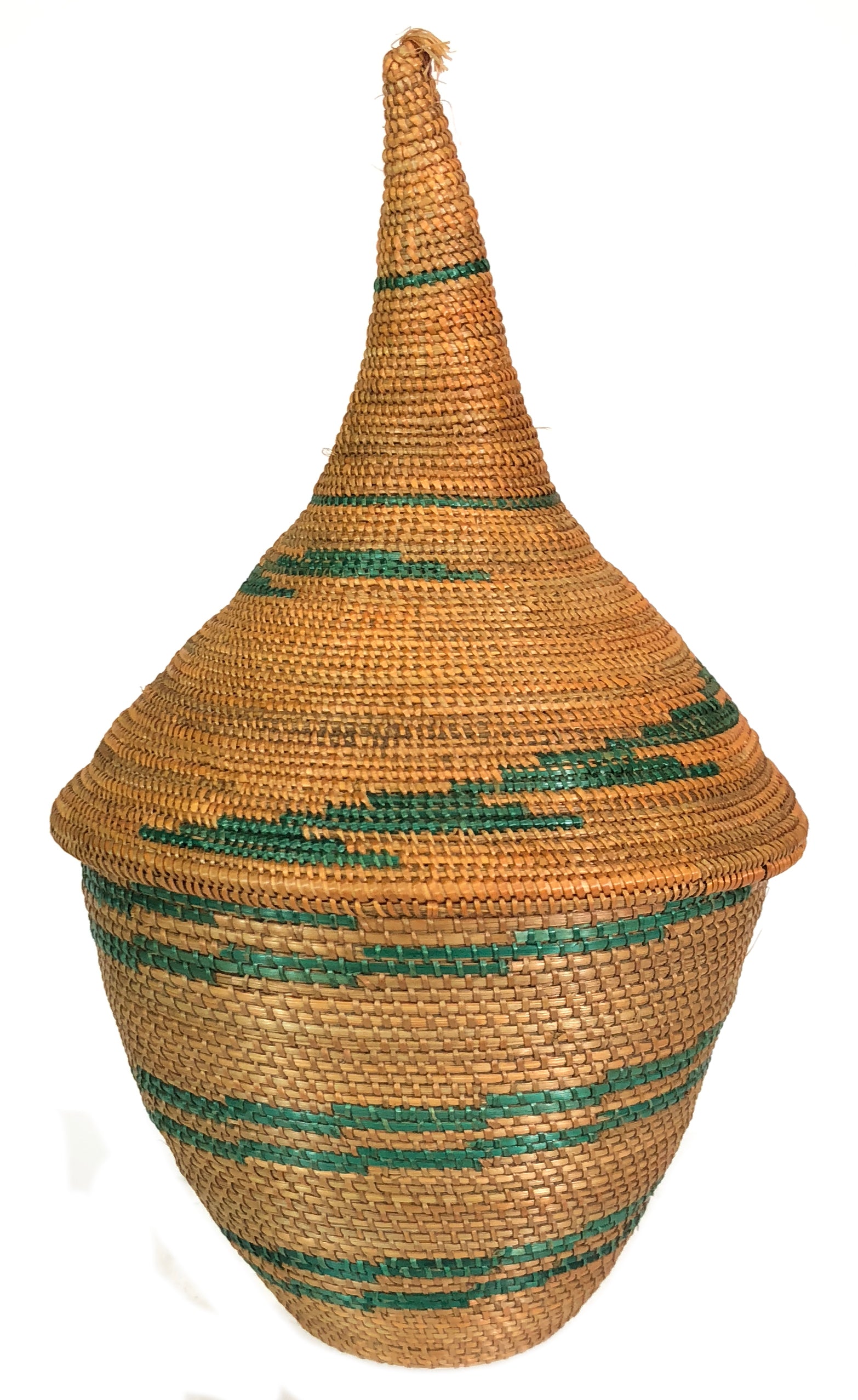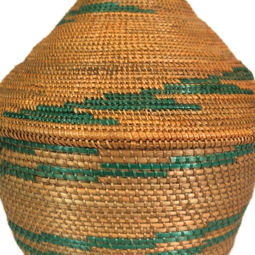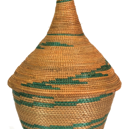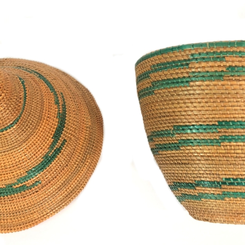 Made from from vegetable fibers by the Tutsi women. The grasses of these trees were soaked in the water for roughly two weeks until the fibers become pliable. The basket is made from naturally occurring dyes in the surrounding area. The reddish brown dye is made from the seeds and roots of the urukamgi plant. What really sets these baskets apart from the rest is their very intricate weaving patterns and use of very fine woven material. The range of patterns is quite diverse shows the innovation of women from Rwanda. Baskets such as these could also be given as wedding gifts. This basket measures 7″ x 4″