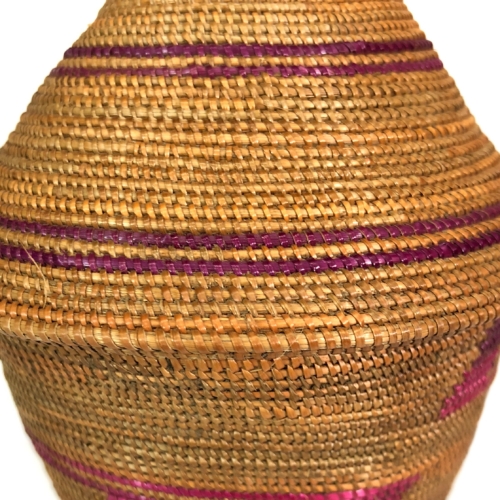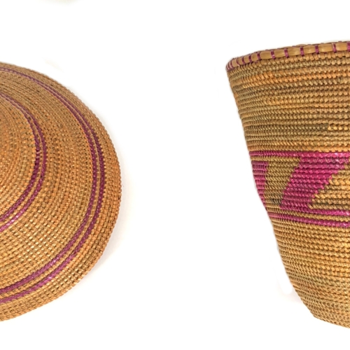 Made from from vegetable fibers by the Tutsi women. The grasses of these trees were soaked in the water for roughly two weeks until the fibers become pliable. The basket is made from naturally occurring dyes in the surrounding area. The reddish brown dye is made from the seeds and roots of the urukamgi plant. What really sets these baskets apart from the rest is their very intricate weaving patterns and use of very fine woven material. The range of patterns is quite diverse shows the innovation of women from Rwanda. Baskets such as these could also be given as wedding gifts. This basket measures 7″ x 4″