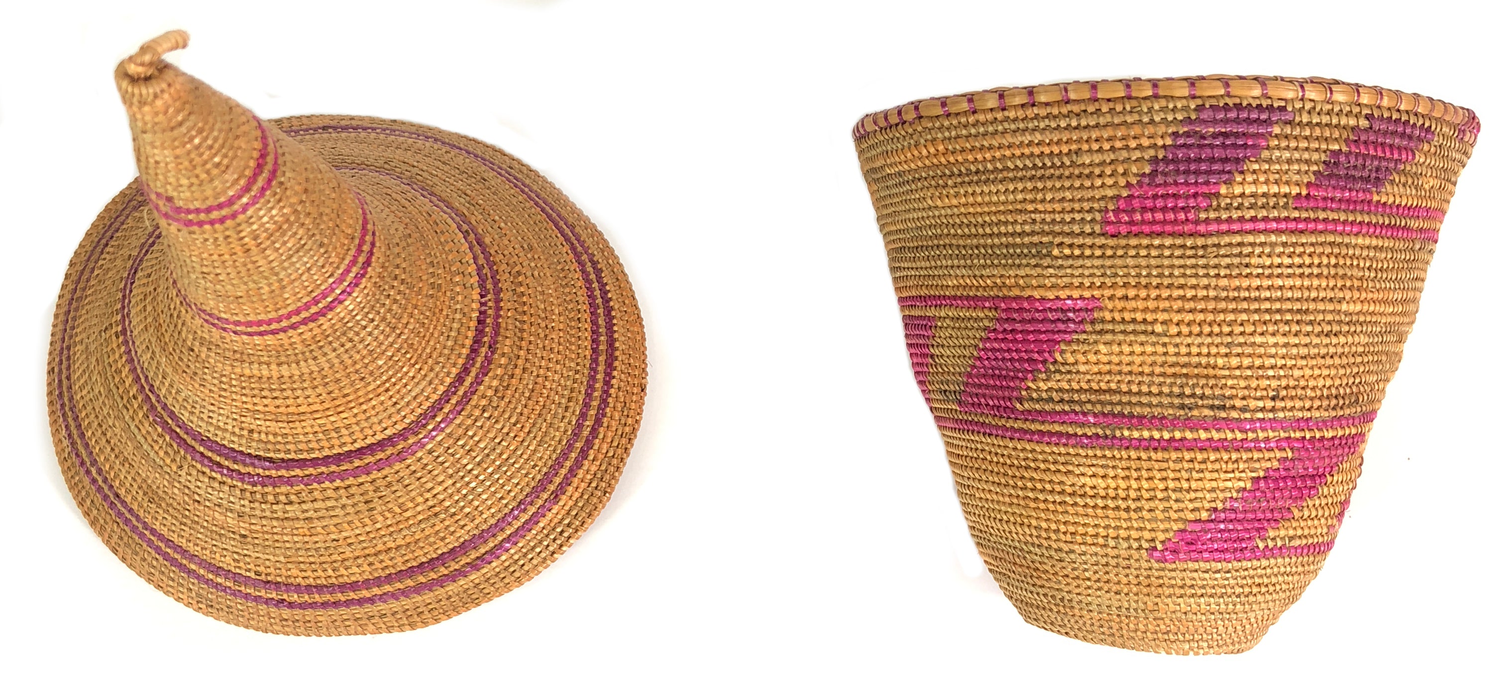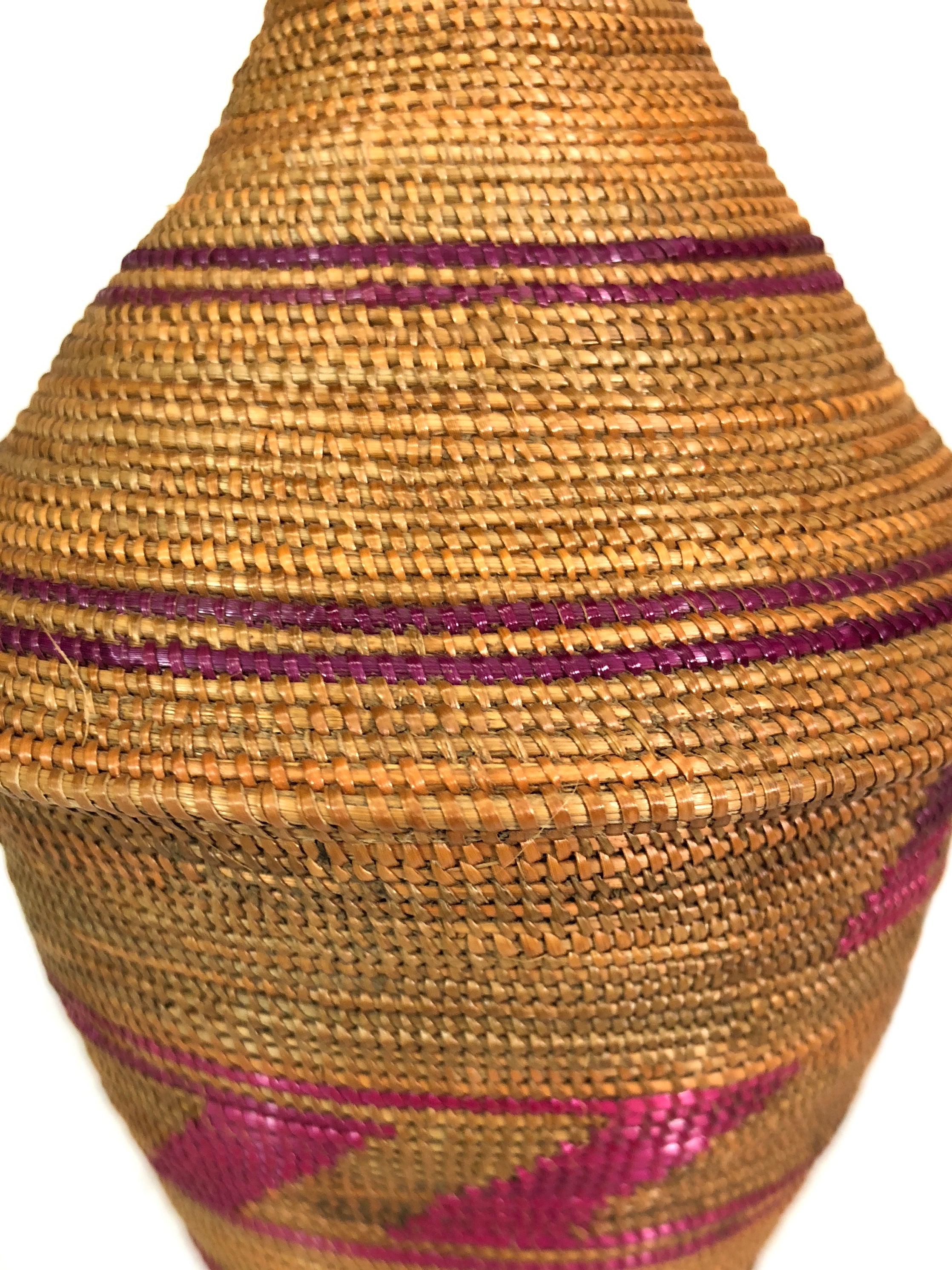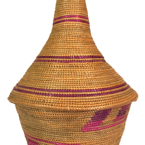 Made from from vegetable fibers by the Tutsi women. The grasses of these trees were soaked in the water for roughly two weeks until the fibers become pliable. The basket is made from naturally occurring dyes in the surrounding area. The reddish brown dye is made from the seeds and roots of the urukamgi plant. What really sets these baskets apart from the rest is their very intricate weaving patterns and use of very fine woven material. The range of patterns is quite diverse shows the innovation of women from Rwanda. Baskets such as these could also be given as wedding gifts. This basket measures 7″ x 4″