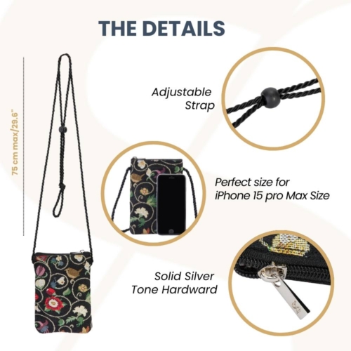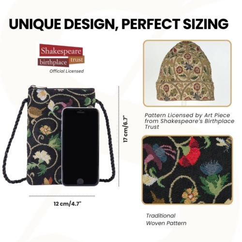 FABRIC COMPOSITION: 100% Polyester.EASY CARE: Clean it with a damp cloth. Do not soak in water.Enjoy your day with a unique branded medium shoulder bag by Signare.[custom_html]UNIQUE LIFESTYLE DESIGN: Heritage Design, Licensed from Shakespeare Birthplace Trust Jacobean Dream design is inspired by a richly embroidered gentlemen’s cap in the Shakespeare Birthplace Trust’s collection. The nightcap was a popular item of headwear in Shakespeare’s time, which would have indicated the wearer’s wealth, education and standing. © Shakespeare Birthplace Trust Every purchase supports the vital care and conservation of the Shakespeare Houses and Collections. PRODUCT DESCRIPTION: This stylish smart purse/bag is handy for when you don’t want to take a bag out with you. Small but perfect size for storing your phone, cards, cash, and lipstick – just what you need when you have nowhere to leave your items securely while dancing the night away The smooth corded strap can be adjusted with a toggle so you can make it longer or shorter Slip into your pocket or sling across one shoulder Perfect size for storing your phone, passport, cards, keys, and other important items Fastened with a zip top Lined with a patterned nylon for protection Product dimensions approx. W 4.72″ x H 6.69″ x 0.4″, weight approx. 0.13lb Please note Design may vary due to our production methods See All Smart Bag Designs See All The models in Alice in Wonderland collection[/custom_html]