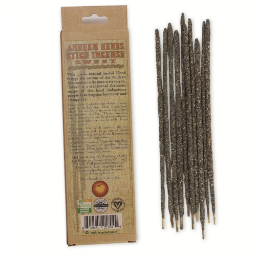 This 100% natural herbal blend brings the aroma of the Andean Mountains in its pure state to you. Based on traditional shamanic recipes of the indigenous people from the Andes, each blend carries meaning and intention to help one achieve personal goals, happiness and well-being. Smudge your home, sacred space, or office to enhance mood, purification, and state of mind. ‘Sweet’ is a traditional shamanic recipe of the local indigenous people That inspires harmony and tranquility. Key benefits: Aromatic 100% natural incense. Energetically purifying. Certified Vegan. These incense sticks are handmade in the rural Colombian Andes, providing employment to marginalized artisans. Certifications: Certified Vegan Gold-level Green America business certification Charitable Cause: Prabhuji’s Gifts supports Prabhuji Mission, a New York based, nonprofit religious organization that is home to a spiritual community. The mission’s volunteers, being engaged in selfless service, run different humanitarian projects including: Prabhuji Food Rescue Program, Prabhuji Food Distribution Program and the Prabhuji Toy Distribution Program. Ingredients: Coconut, Vegetable Mucilage, Bamboo, Organic Vegetable resins, Eucalyptus, Mint, Lavender, Chamomile, Spearmint, Tangerine, Anise. How to use: Light the tip of the incense until it catches fire. Blow it out and place the smoking incense stick into an incense holder. These incense sticks contain no artificial ingredients, so they might need to be re-lit from time to time. Use with caution and never leave unattended. Keep out of reach of children and away from flammable articles. Not for ingestion. Specs SKU: 217-04UPC: 809581217049Contains: 10 incense sticks, 5″ eachLXWXH: 2″x0.625″x7″Weight: 0.6 oz.Made in Colombia Return Policy: This product is fully refundable.