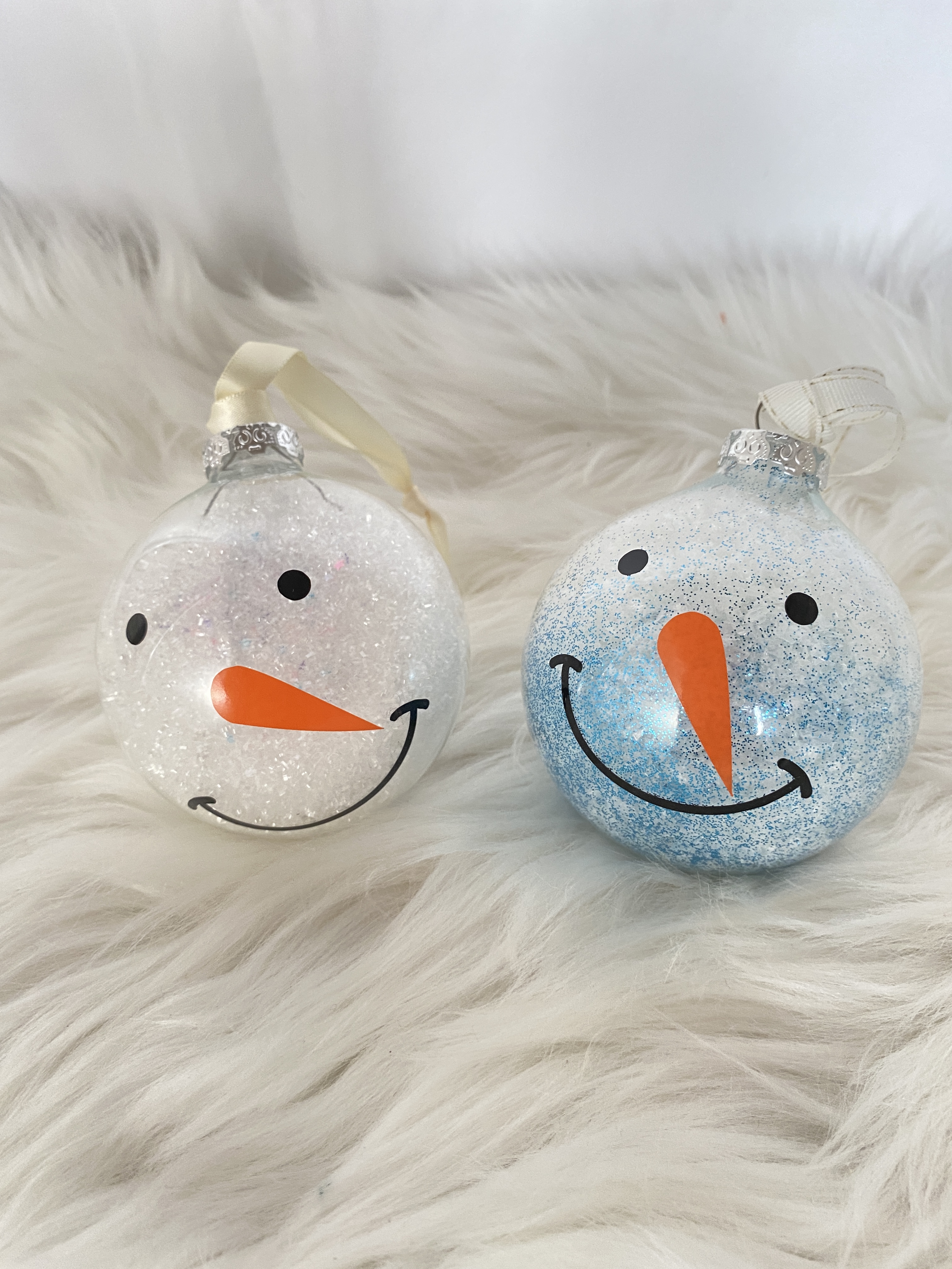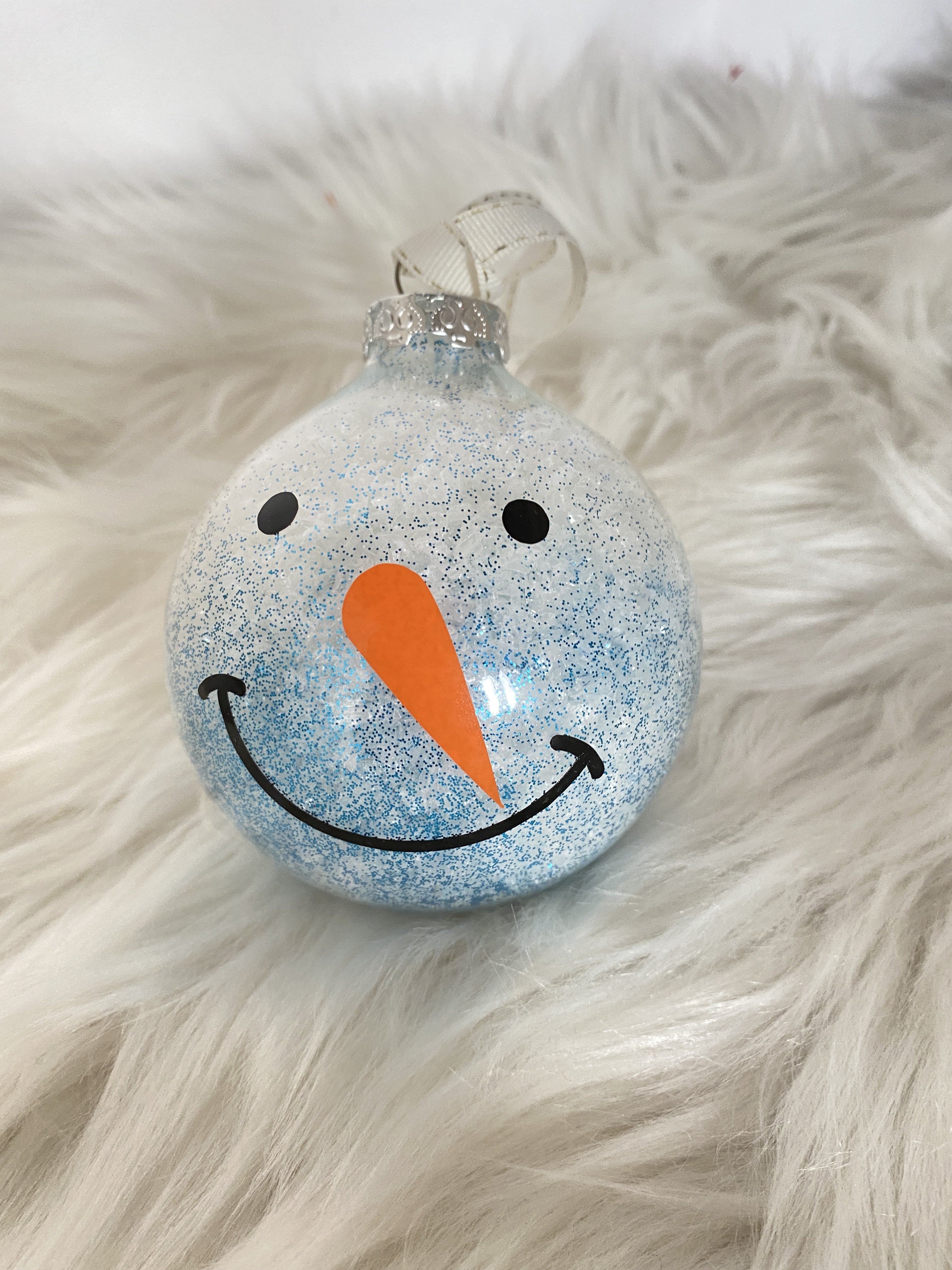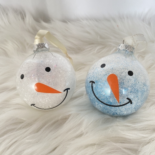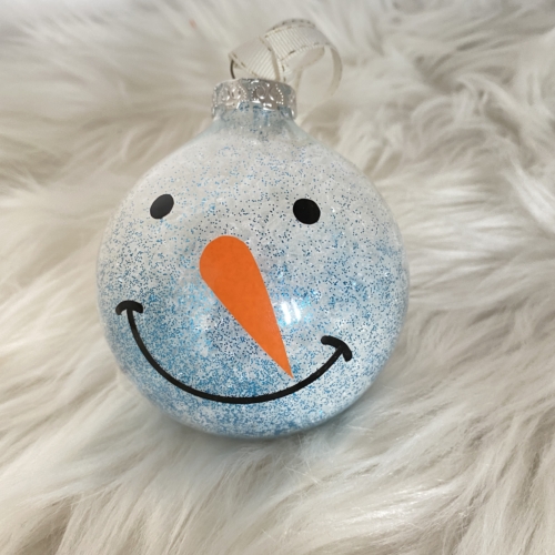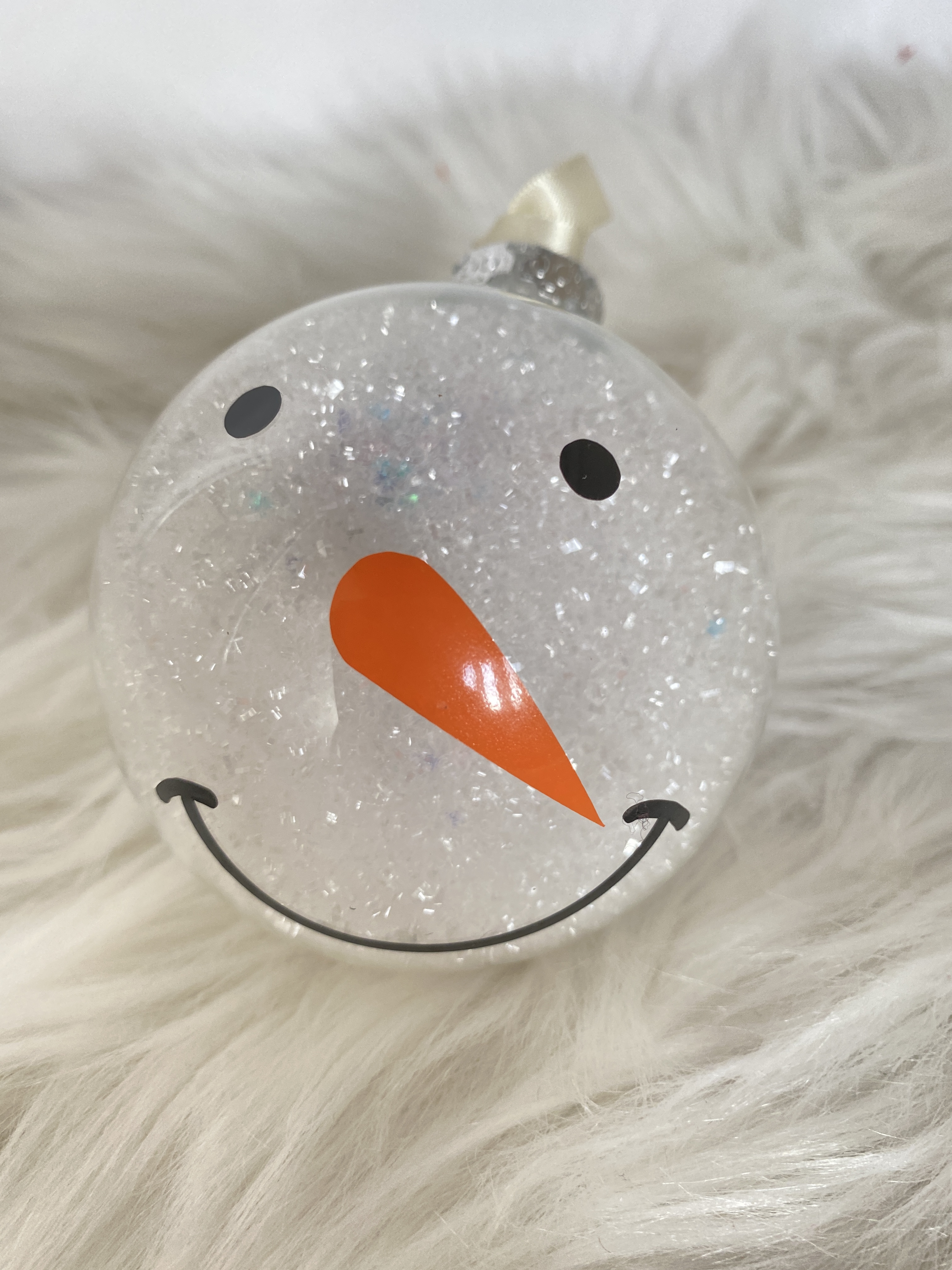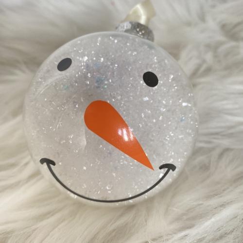 Snowman decal filled with artificial snowDecorated Christmas glass bauble 8cm