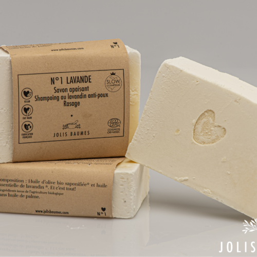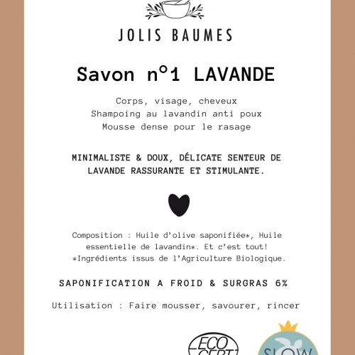 Le savon n°1 LAVANDE est simple, doux, hydratant, avec une délicate odeur de lavande rassurante et stimulante. Il est bénéfique en savon shampoing pour les cheveux légèrement secs et les cuirs chevelus sensibilisés. Légère action répulsive contre les poux grâce au lavandin.