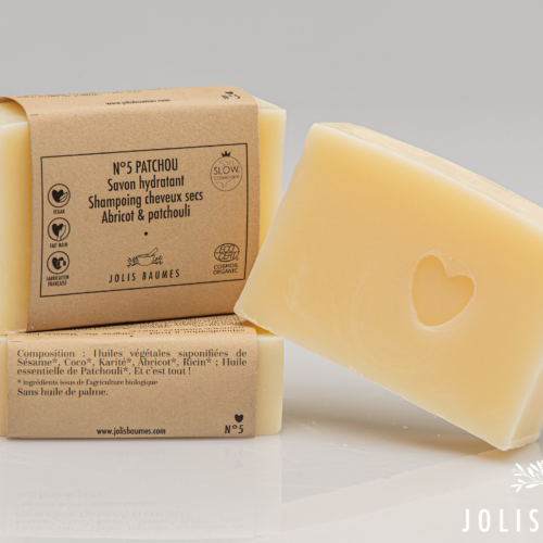 Composition: Saponified sesame*, castor* and apricot* oils, saponified coconut butter* and shea*, patchouli essential oil*. And that’s it!