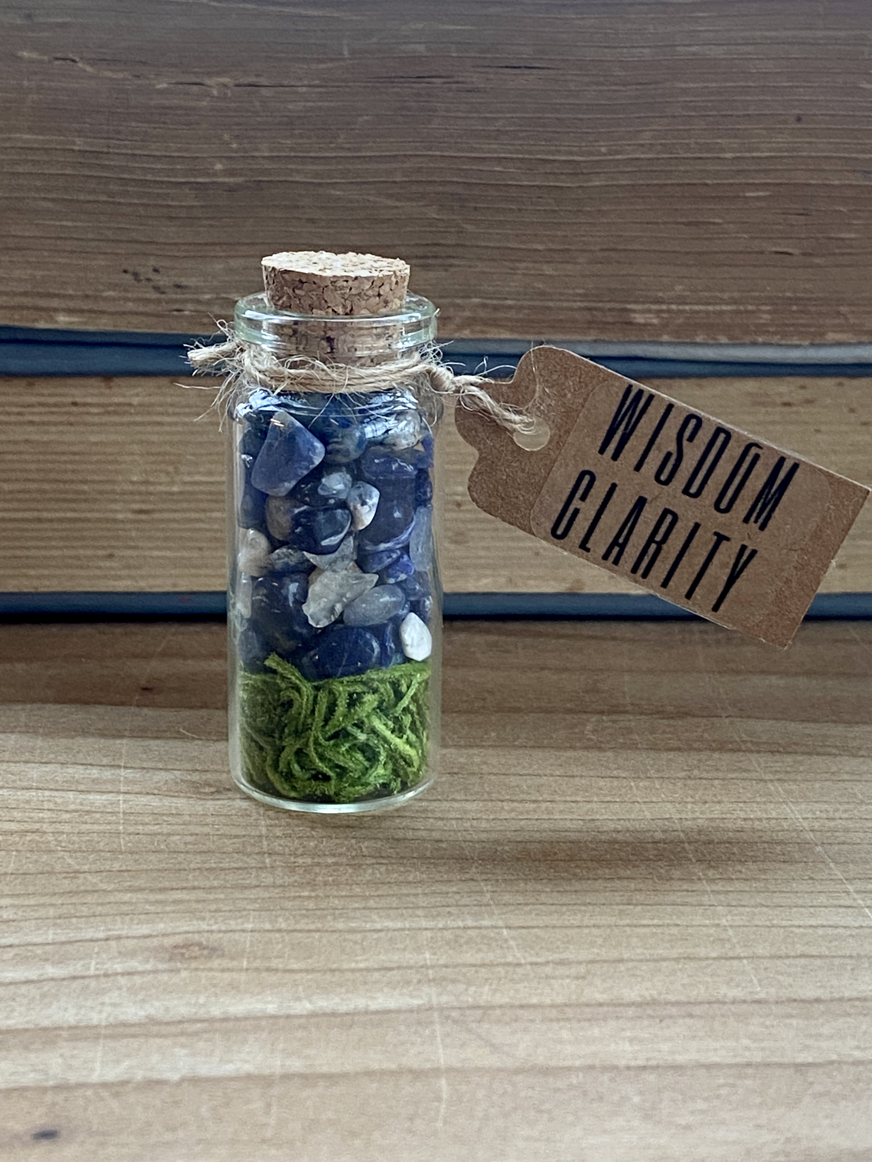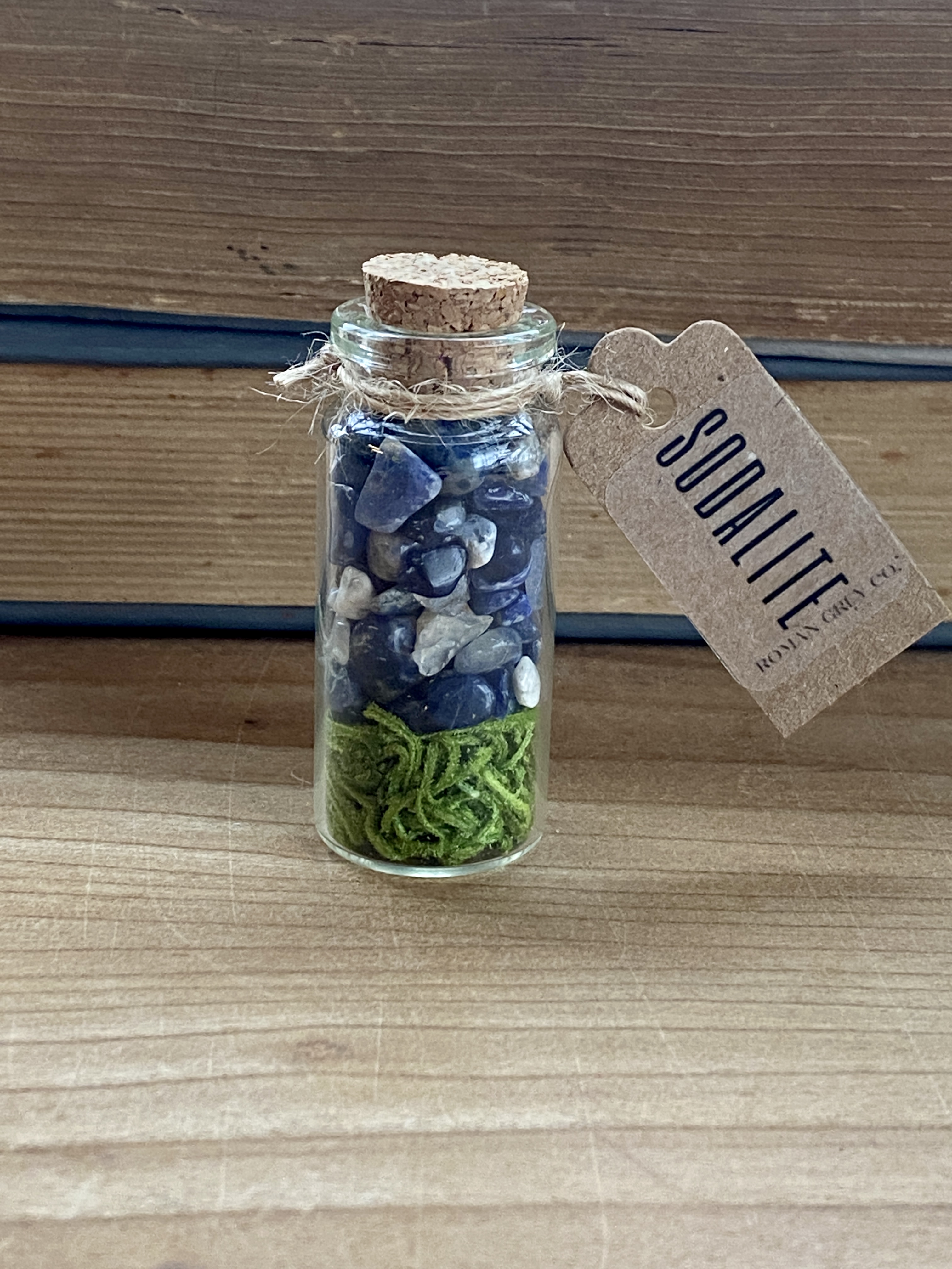 Sodalite rests on a bed of Spanish moss in a glass vile with a cork closure.