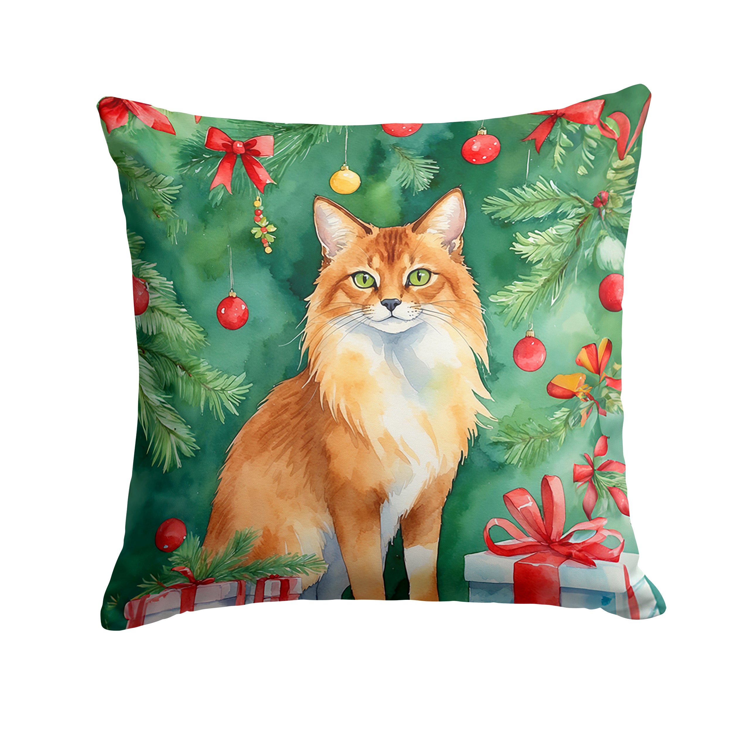 Throw Pillow featuring breed specific Somali Cat artwork. Celebrate Christmas with this Christmas Pillow. Revitalize your outdoor or indoor living space with Caroline’s Treasures 18×18 Fabric Decorative Pillow. With a generously sized dimension of approximately 18 inches by 18 inches, this pillow makes a comfortable and aesthetic addition to any seating area. Made from a unique, water-resistant material developed by Caroline’s Treasures, the pillow sham is 100% polyester fabric that’s durable and ready to weather any condition. Its vibrant, full-color artwork will not fade over time as it is dyed with color-fast dyes. Whether you place it on your patio furniture, porch, veranda, or indoor couch, its soft canvas fabric ensures a cozy experience. The pillow is handcrafted in the United States, featuring a sham created from three pieces of fabric and a polyester insert for enduring shape and overstuffed comfort. Despite being robustly built to endure the outdoors, it is as soft and snug as your favorite indoor cushions. Please note, as all our pillows are handmade, sizes may vary slightly, adding to the charm of this unique decorative item.