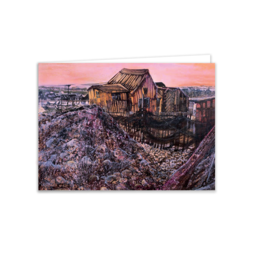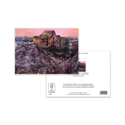 A characterful coastal study from Susan Horsfield: weather-beaten fishing huts and draped nets along the River Blyth at Southwold. Gouache, pastel and ink add layered texture to shingle, timber and evening sky—strong architecture/landscape crossover that merchandises with coastal and heritage ranges.