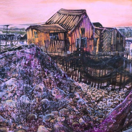 A characterful coastal study from Susan Horsfield: weather-beaten fishing huts and draped nets along the River Blyth at Southwold. Gouache, pastel and ink add layered texture to shingle, timber and evening sky—strong architecture/landscape crossover that merchandises with coastal and heritage ranges.