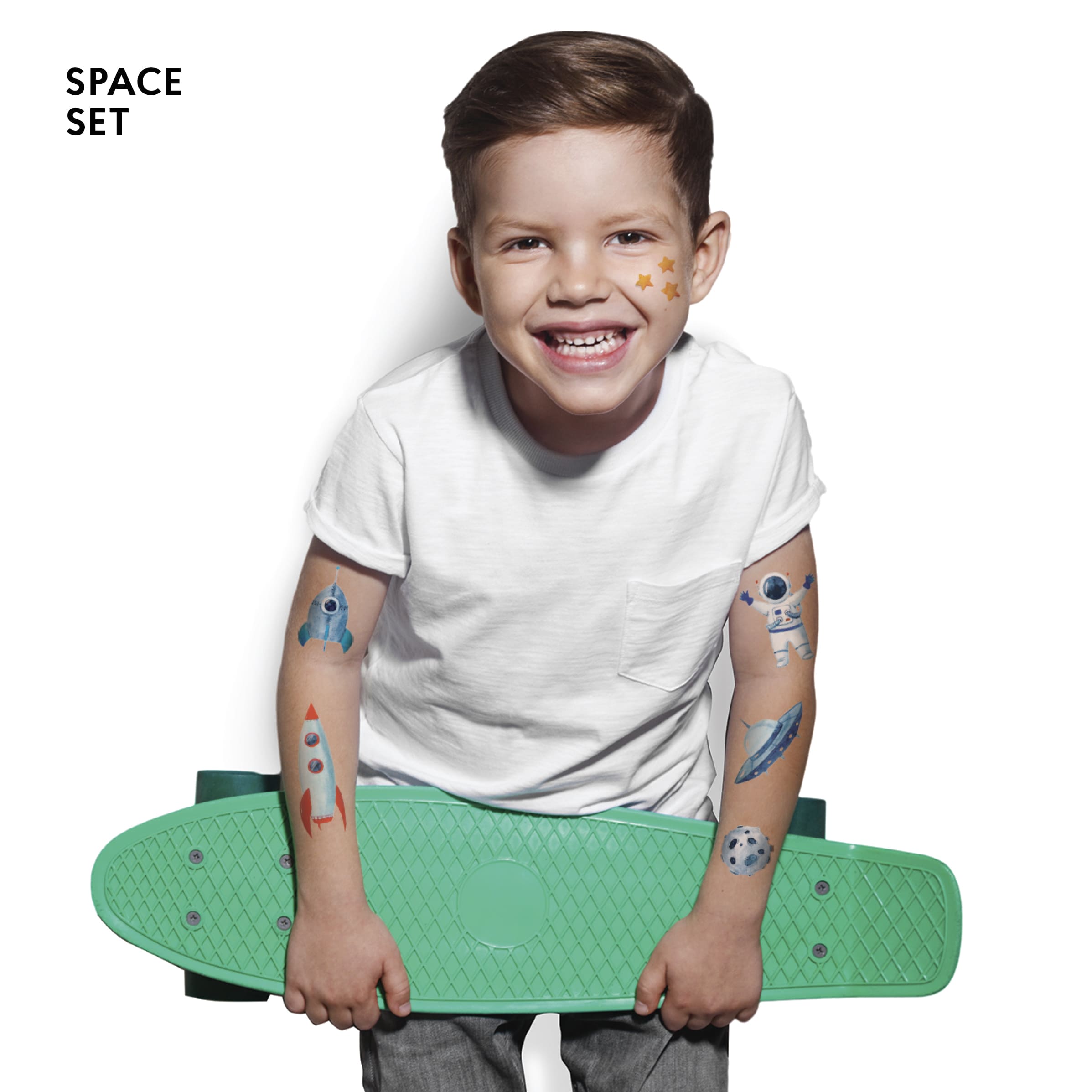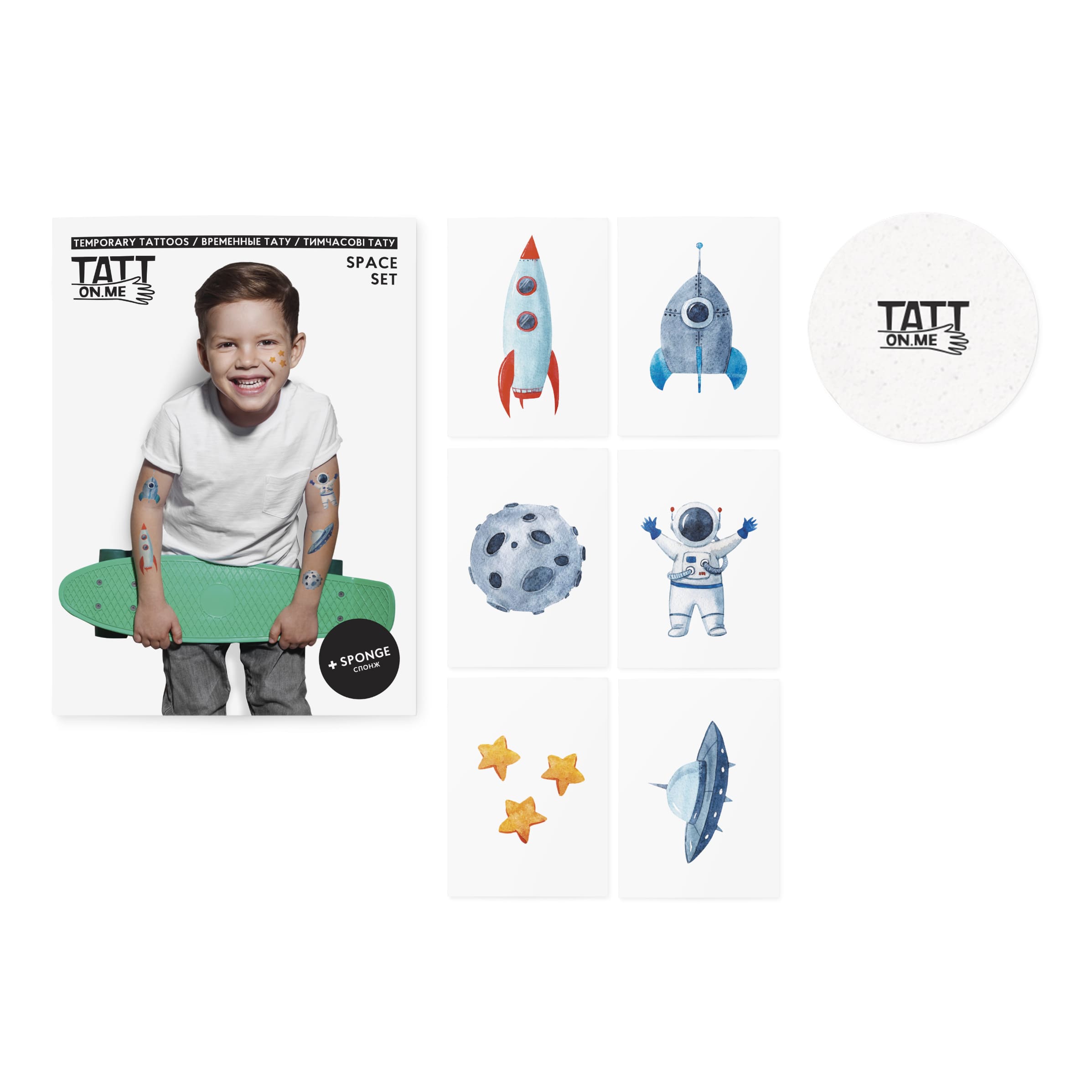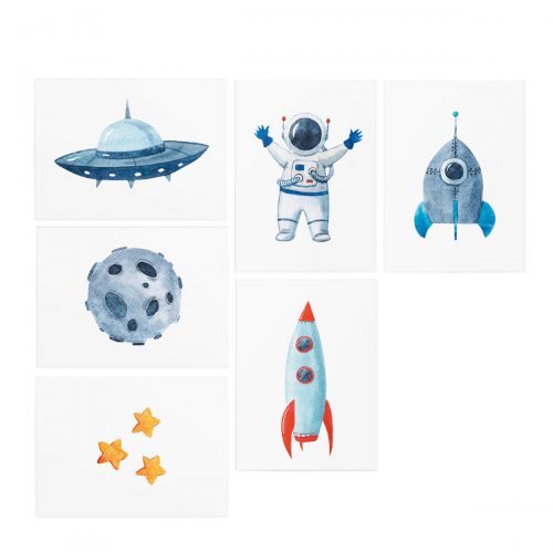 Space temporary tattoos set is made for young explorers and astronauts. Go on an exciting imaginary trip to the Moon and back with the whole family and take some awesome photos. Don`t forget to share one or two with the Houston! The set contains 6 separate tattoos and an application sponge.