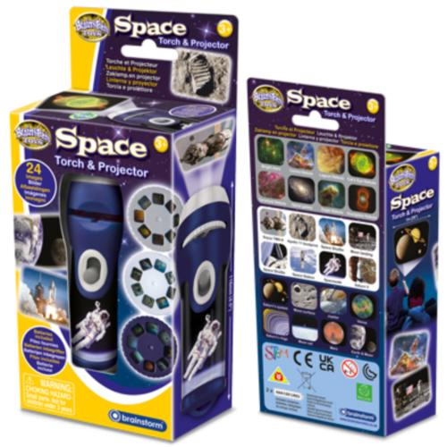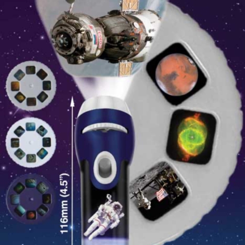 Bring space into your bedroom with this fantastic projector torch. Simply shine the torch around your room and turn your bedroom into outer space. View NASA images on your walls and ceilings including astronauts, space shuttles, planets and nebula–a great bedtime companion to make going to sleep more fun. The torch comes with three slide discs with 24 colour NASA photographs. Swap and change the slides easily by pulling back the plastic flap and inserting the chosen disc then rotate the disc round to view the fantastic colour images which project up to one metre wide whilst maintaining clarity. Images are easily focused by turning the lens head. This product can be used as a normal torch without the slides in place and is great for keeping on bedside tables to give comfort to children during the night.