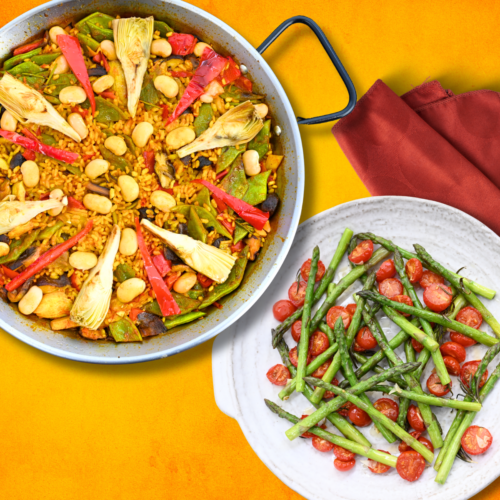 Bring the taste of Spain to your kitchen with our vibrant Vegan Paella and asparagus with tomato Confit.