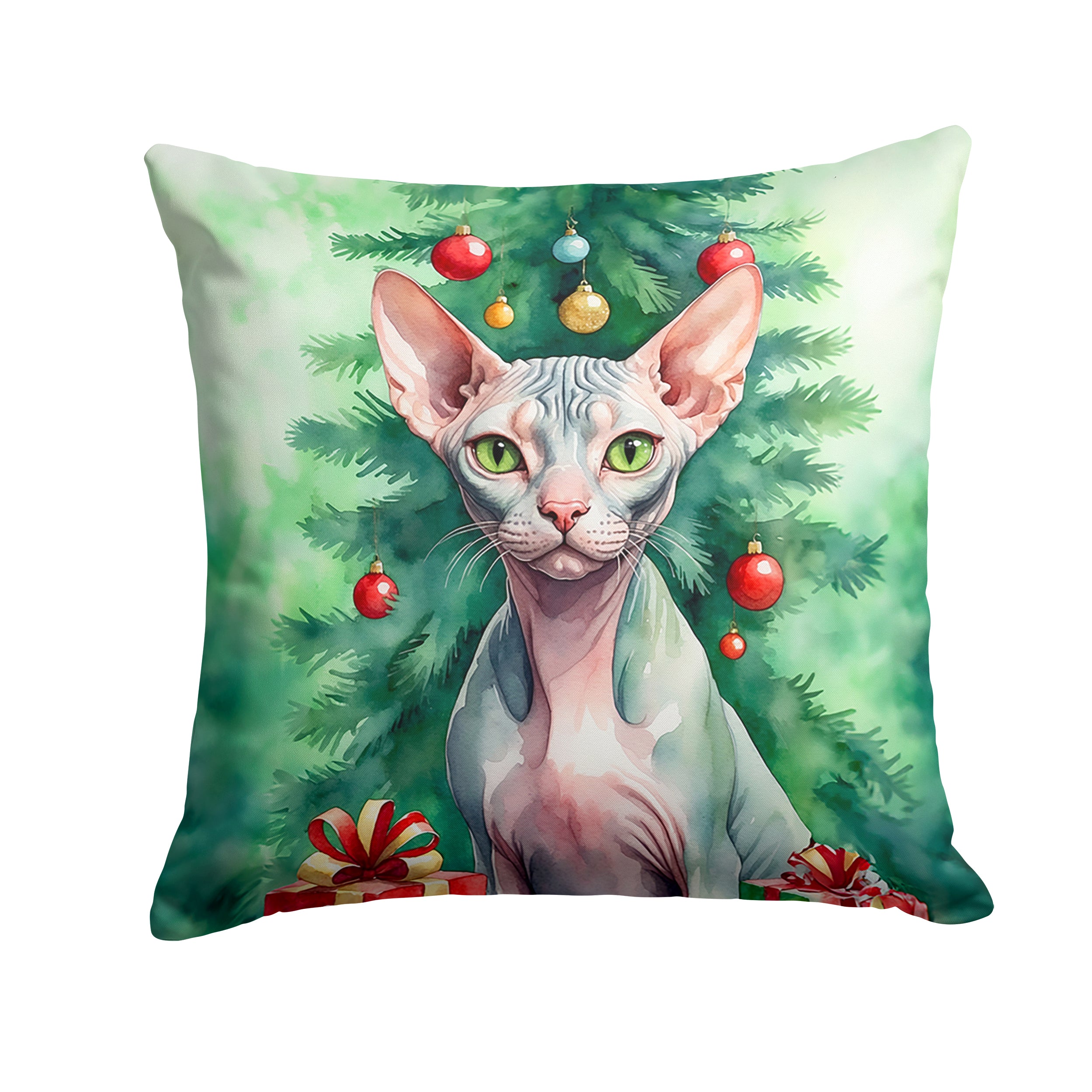 Throw Pillow featuring breed specific Sphynx Cat artwork. Celebrate Christmas with this Christmas Pillow. Revitalize your outdoor or indoor living space with Caroline’s Treasures 18×18 Fabric Decorative Pillow. With a generously sized dimension of approximately 18 inches by 18 inches, this pillow makes a comfortable and aesthetic addition to any seating area. Made from a unique, water-resistant material developed by Caroline’s Treasures, the pillow sham is 100% polyester fabric that’s durable and ready to weather any condition. Its vibrant, full-color artwork will not fade over time as it is dyed with color-fast dyes. Whether you place it on your patio furniture, porch, veranda, or indoor couch, its soft canvas fabric ensures a cozy experience. The pillow is handcrafted in the United States, featuring a sham created from three pieces of fabric and a polyester insert for enduring shape and overstuffed comfort. Despite being robustly built to endure the outdoors, it is as soft and snug as your favorite indoor cushions. Please note, as all our pillows are handmade, sizes may vary slightly, adding to the charm of this unique decorative item.