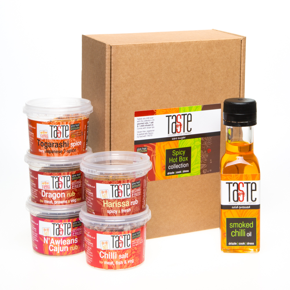 Our Our Spicy Hot Box is a great gift for chilli lovers & a great way to boost creativity in the kitchen. Packed with 5 of our hot rubs & salts plus a gorgeous infused chilli oil:
