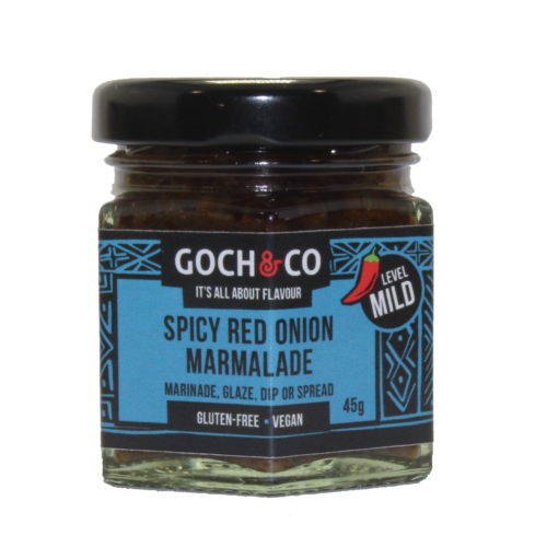 Spicy Red Onion Marmalade A mild, deep-red, and sweet-savoury marmalade, with earthy overtones and smoky aromas. A delicious topping for grilled meats and great with mature cheddar, blue, and goat cheese, on pulled pork, and sandwiches. Simply add to quiches, pizzas, mash, stir-fries, and salads. You can serve this delicious marmalade with cheese and cured meat platters. Gluten-free. No GM. No GMS. Vegetarian. Vegan. No Artificial Additives. Recyclable pack. Made in Wales, UK. Heat Level: Mild Servings per 100g: 20 Each Serving: 5g Ingredients: Red Onions (64%), Chilli Peppers, Spirit Vinegar, Sugar, Olive Oil, Herbs & Spices, Salt. Allergen Advice: For Allergens, including cereals containing gluten, see ingredients in BOLD. Produced in a facility that handles cereals and nuts. Nutrition: Typical Values 100g contains: Energy 635Kj/52Kcal Fat 7.7g of which Saturates 1.1g Carbohydrates 18g of which Sugars 16g Fibre 2.1g Protein 1.1g Salt 0.76g Country of origin: Wales, United Kingdom. Storage: Store in a cool and dry place.