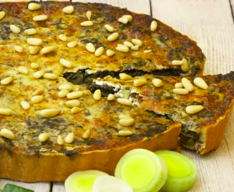 Gluten-free flour blend, organic egg, sunflower spread, olive oil, char-grilled aubergine pesto (contains cashews), soya cream, spinach, leek, cherry tomatoes, dill, parsley, pine nuts, seasonings