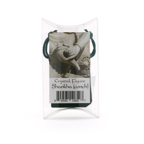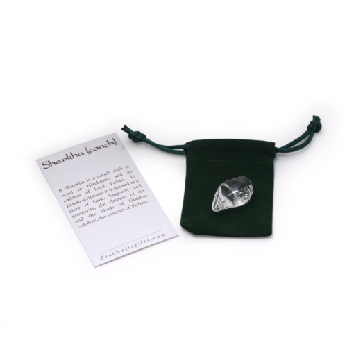 As with all handcrafted items, there will always be slight variation of size and appearance from one piece to another. A Shankha is a conch shell that’s used for rituals in Hinduism, and an emblem of lord Vishnu. In Hindu scriptures, it is praised as a giver of fame, longevity and prosperity, the cleanser of sin and the abode of goddess Lakshmi, the consort of Vishnu. This clear glass figurine includes a small velveteen draw-string bag for keeping it protected while carrying along in your purse, shoulder bag, pocket, etc. as an amulet. Packaged in a clear pillow box with small description card, it’s a thoughtful gift for someone dear. UPC: 8-09581-10652-7 Material: Glass Figurine size: 0.75″ x 0.5″ x 1″ (Approx.) Figurine Weight: 0.247 oz (7 g) Product size: 5”x3”x1” Weight with packaging: 0.74 oz (21 g) Country of Origin: India