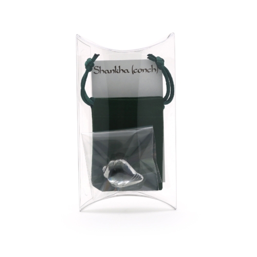 As with all handcrafted items, there will always be slight variation of size and appearance from one piece to another. A Shankha is a conch shell that’s used for rituals in Hinduism, and an emblem of lord Vishnu. In Hindu scriptures, it is praised as a giver of fame, longevity and prosperity, the cleanser of sin and the abode of goddess Lakshmi, the consort of Vishnu. This clear glass figurine includes a small velveteen draw-string bag for keeping it protected while carrying along in your purse, shoulder bag, pocket, etc. as an amulet. Packaged in a clear pillow box with small description card, it’s a thoughtful gift for someone dear. UPC: 8-09581-10652-7 Material: Glass Figurine size: 0.75″ x 0.5″ x 1″ (Approx.) Figurine Weight: 0.247 oz (7 g) Product size: 5”x3”x1” Weight with packaging: 0.74 oz (21 g) Country of Origin: India