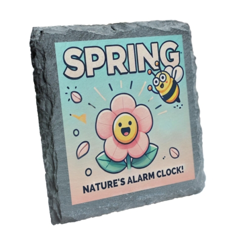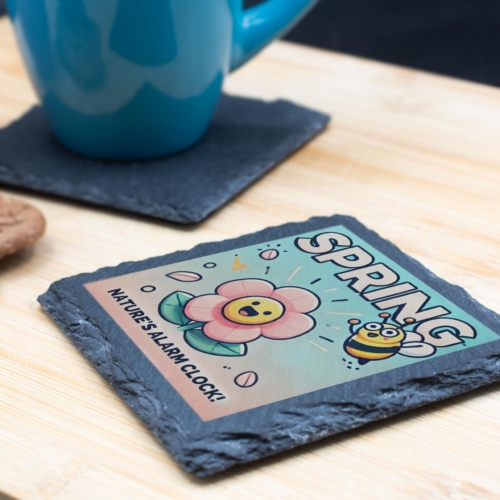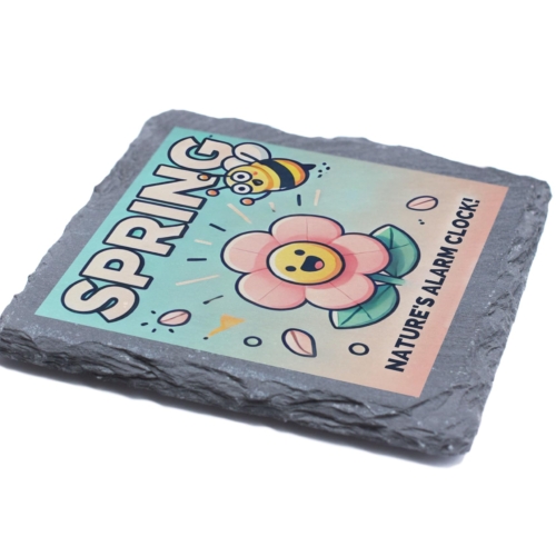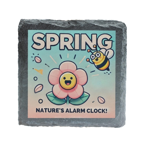 Celebrate the arrival of spring with this charming slate coaster featuring a delightful flower and bee design accompanied by the whimsical phrase “Nature?s Alarm Clock.” Crafted from high-quality natural slate, this coaster combines durability with a rustic aesthetic, making it both practical and decorative. Whether you?re sipping your morning coffee or hosting a spring-themed gathering, this coaster is the perfect way to protect your surfaces in style. Its vibrant design brings a splash of color and joy to any setting, making it a great seasonal addition to your home d?cor. Gift it to a loved one or add it to your collection?this coaster is a must-have for anyone who appreciates the beauty of nature and the changing seasons. Vibrant Spring Design: Features a cheerful flower and buzzing bee graphic with the playful text “Natureâs Alarm Clock.” Premium Quality Slate: Made from durable, natural slate for a rustic and elegant finish. Perfect Size: Measures approximately 10 x 10 cm, ideal for protecting surfaces from drink spills and scratches. Seasonal Charm: Adds a touch of springtime joy to your coffee table, desk, or kitchen. Great Gift Idea: Perfect for nature lovers, gardeners, or anyone who enjoys fun and functional home accessories.+