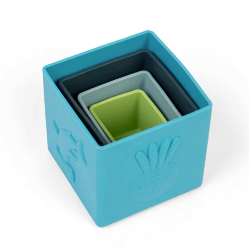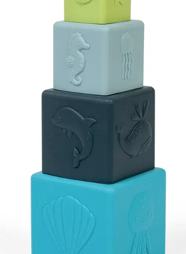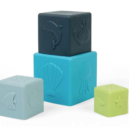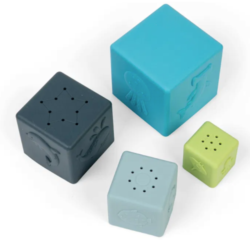 Sort them, stack them, and sprinkle water out of them! These Stacking Cubes are made from soft silicone and styled in seaside shades with friendly ocean creatures on each side. Three of the four cubes also feature small holes on the base, so water will trickle out as kiddies have fun sorting and stacking in the tub. Adding a splash of learning and creativity to bath times, these interactive water toys foster the development of children’s fine motor skills and hand-eye coordination. They also invite kids to explore the concept of cause and effect as they fill, pour, and watch water flow through. Our Stacking Cubes are sustainably made from 100% non-toxic, food-grade silicone. Easy to clean and safe for infants. Conforms to current European safety standards. 9cm H x 9cm W x 9cm D. Suitable from birth. Sea-themed stacking & sorting bath toy Set of 4 cubes Ideal for bath times & water play Made from food-grade silicone 9cm H x 9cm W x 9cm D Suitable from birth