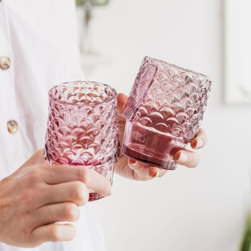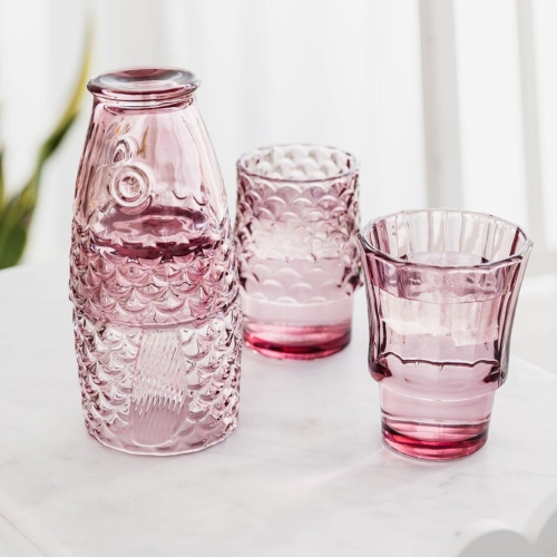 Beautiful fish stacking glass set in rosy pink hue, with four individually shaped 250ml glass tumblers.