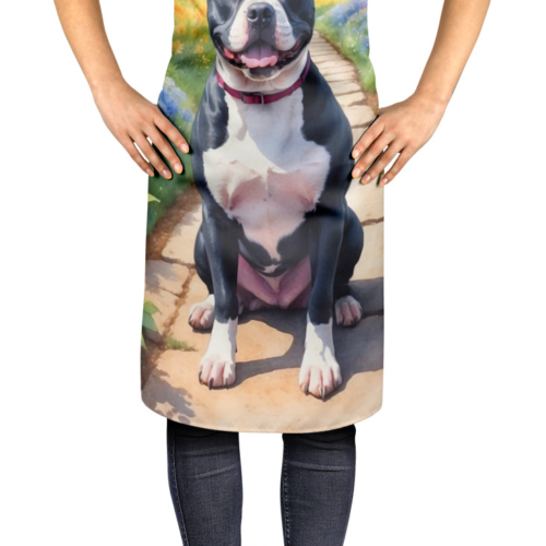 Apron featuring breed specific Staffordshire Bull Terrier artwork. Elevate your cooking, baking, and grilling experiences with our versatile Kitchen or BBQ Apron. This Bib Style apron isn’t just limited to culinary activities – it also serves as an excellent baking apron, artist apron, server apron, gardening apron, or even a dog grooming apron. The apron showcases vibrant full-color artwork contributed by one of our talented artists, bringing a dash of style to your daily tasks. With dimensions of approximately 27″W x 30″H, it provides ample coverage to protect your clothing from spills and splashes. Our apron is meticulously crafted from 100% Ultra Spun Polyester, known for its durability and lightweight nature. The apron comes with white tie straps, ensuring a comfortable and adjustable fit for all. It’s a perfect choice for kitchen apron enthusiasts, whether you are a woman or a man. Designed for easy maintenance, this apron is fully machine washable. The quick-drying polyester material actively reduces staining, keeping your apron looking fresh and new for longer. Our beautifully designed apron isn’t just a functional kitchen accessory – it’s a fashion statement in the culinary world!
