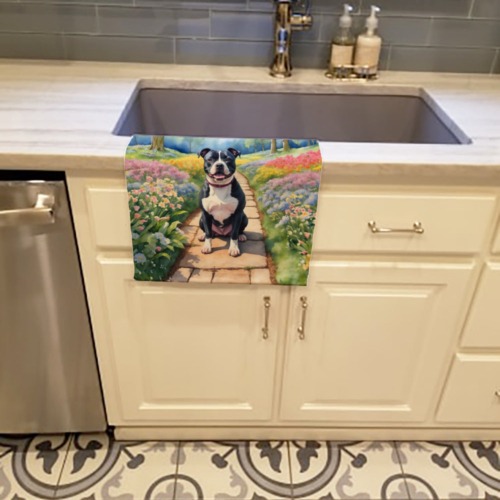 Kitchen Towel featuring breed specific Staffordshire Bull Terrier artwork. Experience the perfect blend of aesthetic appeal and functional excellence with our Plush Velour Kitchen Towels. These are not your ordinary decorative kitchen towels that gather dust. Instead, they are designed to be as practical as they are stylish. The front layer of our towel is constructed from a minky plush polyester, known for its durability and color retention. Unlike conventional kitchen towels, the artwork on our towels is dyed directly into the fabric, ensuring vibrant colors that last. Polish your glassware to a brilliant sparkle using the plush front side of the towel. Flip to the back, crafted from 100% cotton terry loop, to exploit its exceptional absorbency for drying dishes or wiping down counters. Our kitchen towels redefine the concept of functional art, offering lasting quality that maintains the towel’s shape over time. Measuring 15 inches by 25 inches and weighing 2.3 lbs per dozen, these towels deliver an overwhelming sensory experience with their soft, plush, and smooth texture. The edges are meticulously finished with binding, enhancing their durability and visual appeal. For your convenience, these towels are machine washable and can be dried on low heat. After the first wash, the top fabric becomes even softer and fluffier, eliminating the need for ironing. Treat your kitchen to the luxury and functionality it deserves with our plush velour kitchen towels.