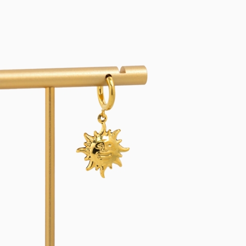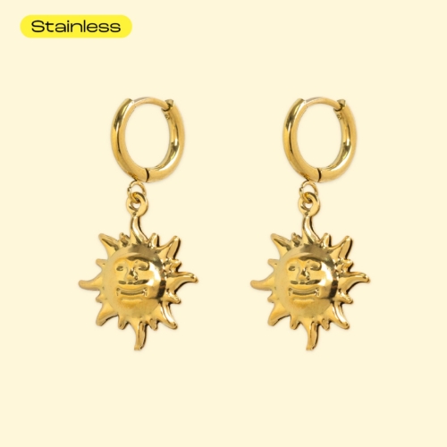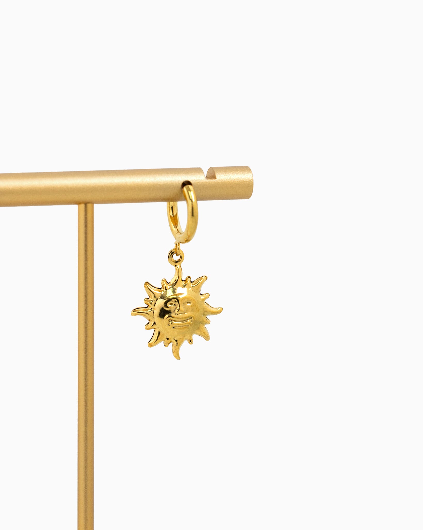 SESSORI EXCLUSIVE A radiant drop earring design featuring sculptural sun motifs suspended from sleek hoop earrings. Crafted from stainless steel for durability and long-lasting shine, these earrings are lightweight, tarnish-resistant, and ideal for everyday wear. Material: Stainless Steel Size: 16 × 20mm