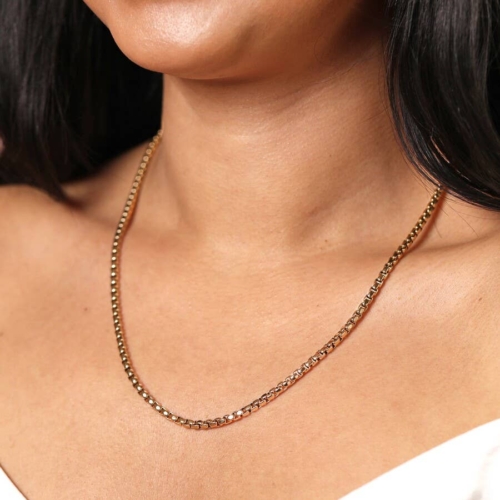 A modern box chain necklace in stainless steelWith a paperclip chain extenderWaterproof and tarnish-proofPerfect for contemporary jewellery collectionsDimensions: length 40.5cm (16″) with a 5cm extenderMade from: 14ct gold plated stainless steel