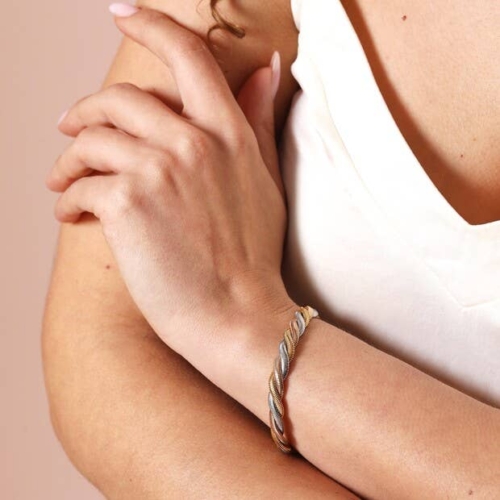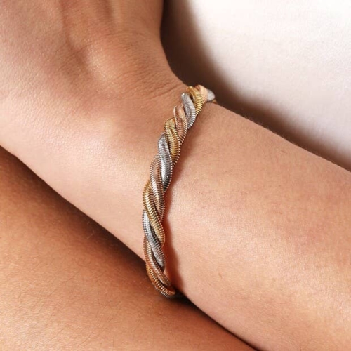 Featuring a gold, silver and rose gold-coloured snake chain, each strand is held in a silver fixing and the bracelet fastens via a lobster clasp. Adjust the bracelet using the extender chain to find a size that suits. Dimensionsinner circumference – 16.5cm with a 3cm extender chainMade from14ct gold plated stainless steel, 14ct rose gold plated stainless steel, stainless steel