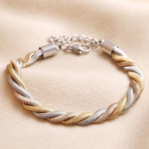 Featuring a gold, silver and rose gold-coloured snake chain, each strand is held in a silver fixing and the bracelet fastens via a lobster clasp. Adjust the bracelet using the extender chain to find a size that suits. Dimensionsinner circumference – 16.5cm with a 3cm extender chainMade from14ct gold plated stainless steel, 14ct rose gold plated stainless steel, stainless steel