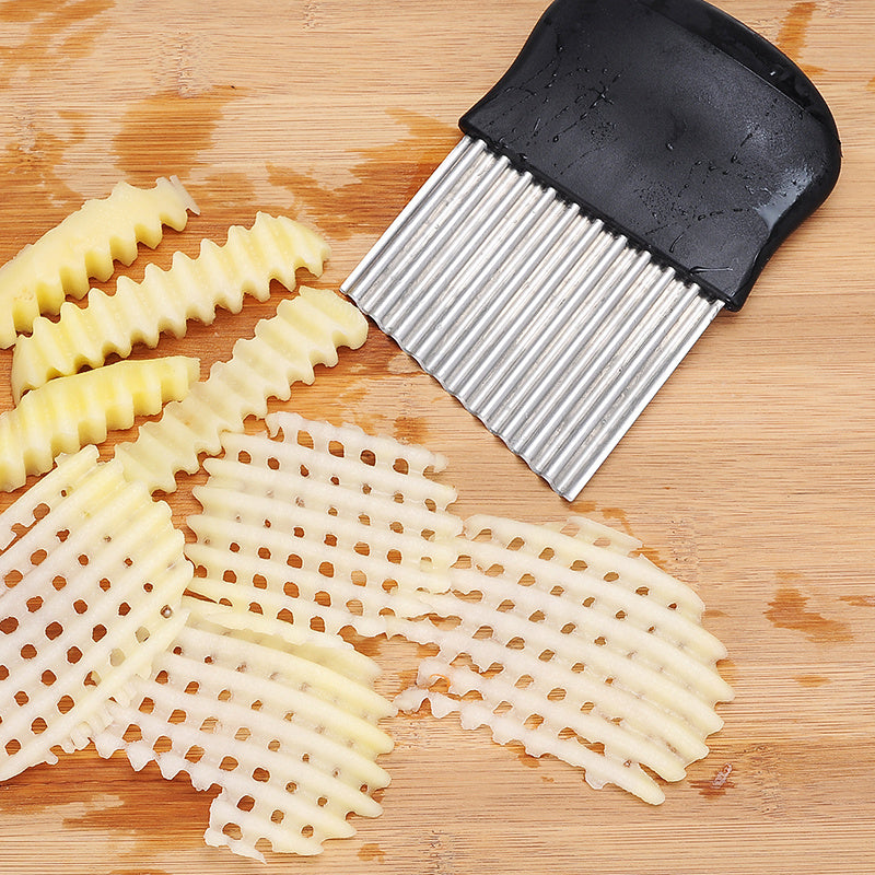 Stainless Steel Crinkle Cutter – Wavy Blade for Stylish Cuts Add a fun and professional touch to your fruits, veggies, and snacks with this Stainless Steel Crinkle Cutter. Designed for effortless slicing, this handy kitchen tool creates attractive wavy cuts that make food more appealing—especially for kids and party platters. Key Features: Durable Stainless Steel Blade: Rust-resistant and sharp for precise cuts through potatoes, carrots, cucumbers, cheese, and more. Ergonomic Handle: Comfortable grip for better control and safety during use. Versatile Use: Ideal for crinkle-cut fries, salad garnishes, pickles, and decorative food presentations. Easy to Clean: Dishwasher-safe or rinse with warm water for quick cleanup. Whether you’re a home cook or a culinary pro, this crinkle cutter makes prepping food more fun and visually appealing. Perfect for healthy snacks, food styling, or getting picky eaters interested in veggies.