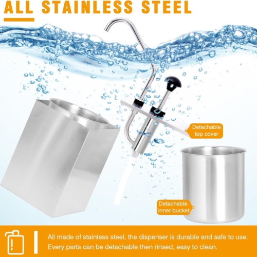 【Easy to clean】 The stainless sauce dispenser adopts detachable pumps and buckets, which is easy to assemble and clean. Comes with flexible brush, you can throughly clean the pump without disassembly. It is suggested to clean the pump after each use. You can rinse these out and then soap wash them and pump through with clear water until clear.
