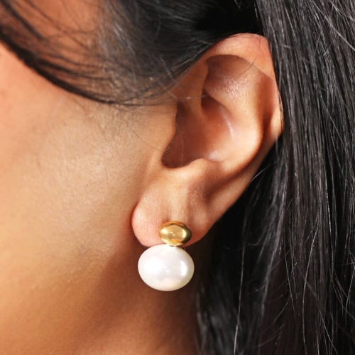 A 14ct gold plated pair of stainless steel earringsTarnish-resistant and waterproofWith a gold ball stud attached to an oval pearlDimensions: width 2cm x height 1.5cmMade from: stainless steel