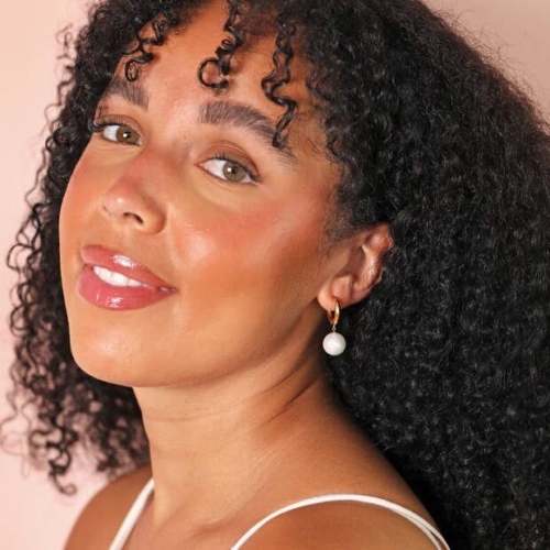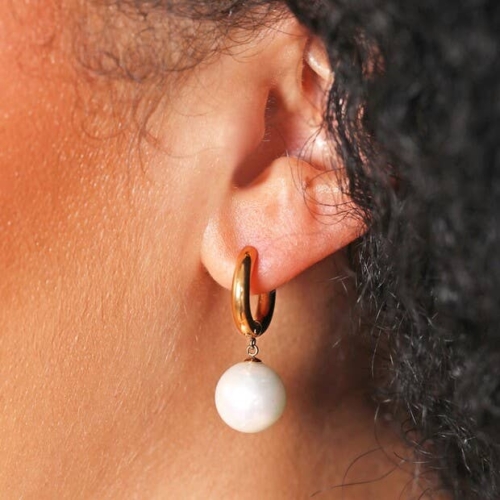 The classic small hoops will hug your lobe before leading to a large, oversized glass pearl drop charm in a shimmering finish to catch the light.Dimensionsfull height 3cminner width – 10mmouter width – 15mmpearl width 10mm x height 10mmMade from14ct gold plated stainless steel, glass pearl