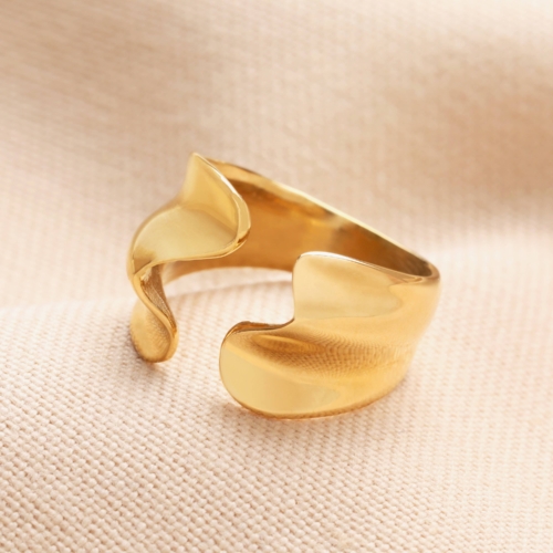 Made from 14ct gold plated stainless steel, this ring features a unique open front with a unique rippled effect to the two wider ends. Both ends of the opening to the ring can be gently prized apart to widen and adjust to the perfect size. Simply squeeze them back together once the ring is on your finger to secure in place.DimensionsadjustableUK ring size OMade from14ct gold plated stainless steel