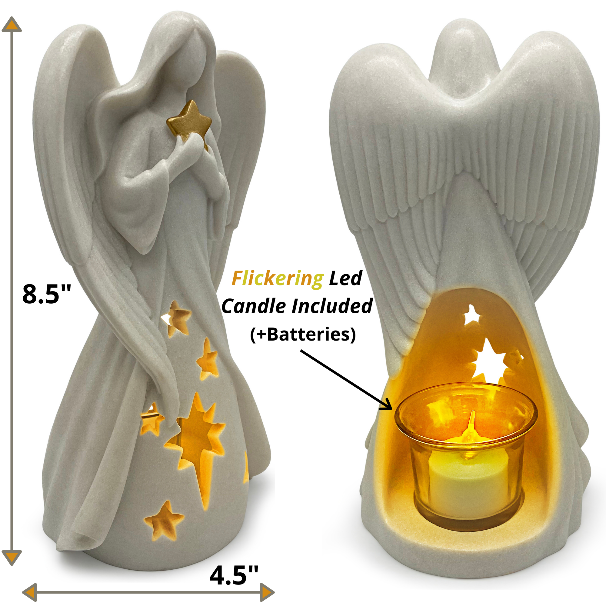 EXPRESS YOUR SYMPATHY: When someone you care about loses someone they love, it’s not about what you say but rather what you do. Express your sympathy and provide comfort by giving or sending this unique memorial candle holder. The angel holding a golden Star is an extraordinarily powerful gift that will mean the world to the family or friends who have lost someone special. A SYMPATHY GIFT, WORTH GIVING: Don’t just send flowers that will last after few days, when you can send this unique long-lasting gift including a special condolence card. We know finding the right grief gifts can be challenging especially when you’ve never done it before, we designed our tealight holders to provide you with cost-friendly price, that’s just right for most situations. TEALIGHT LED CANDLE INCLUDED: Our memorial candle holders are made of high quality polished resin, it comes with a flameless tealight led candle (batteries included) which glow a warm light and flickers like a real candle, creates a soft and relaxed atmosphere, for repeatable and safe use. Get Yours Today!
