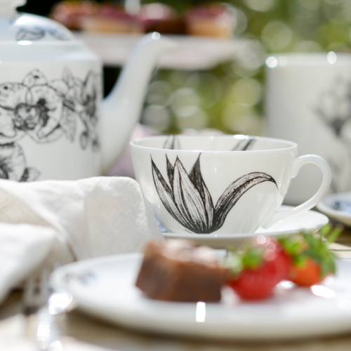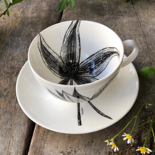 One of our favourites! The sweeping lines of Sarah’s exquisite illustrations of Stargazer Lily and Cinnamon swirl over the cup and saucer, making them fit together like a contemporary floral arrangement. Coffee breaks should always be savoured and stylish…