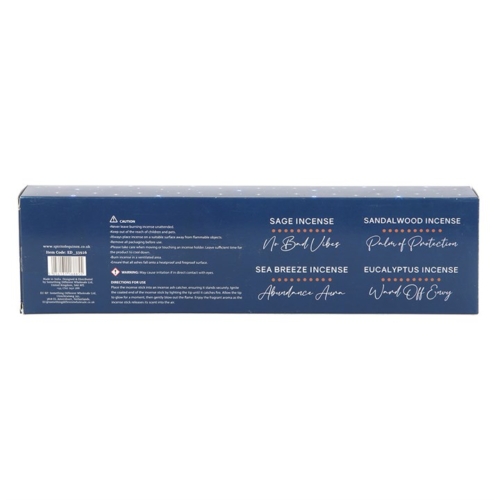 This set of 4 incense stick packs features celestial designs with all seeing eyes, Hands of Hamsa, and starry accents, making it perfect for gifting or personal rituals. Each beautifully designed pack contains 20 incense sticks in calming fragrances: sage, sandalwood, sea breeze, and eucalyptus. Please practice caution when burning, use a suitable incense stick holder and never leave lit incense unattended. Designed by Something Different Wholesale and part of the Starry Eyed collection of celestial gifts and home décor.