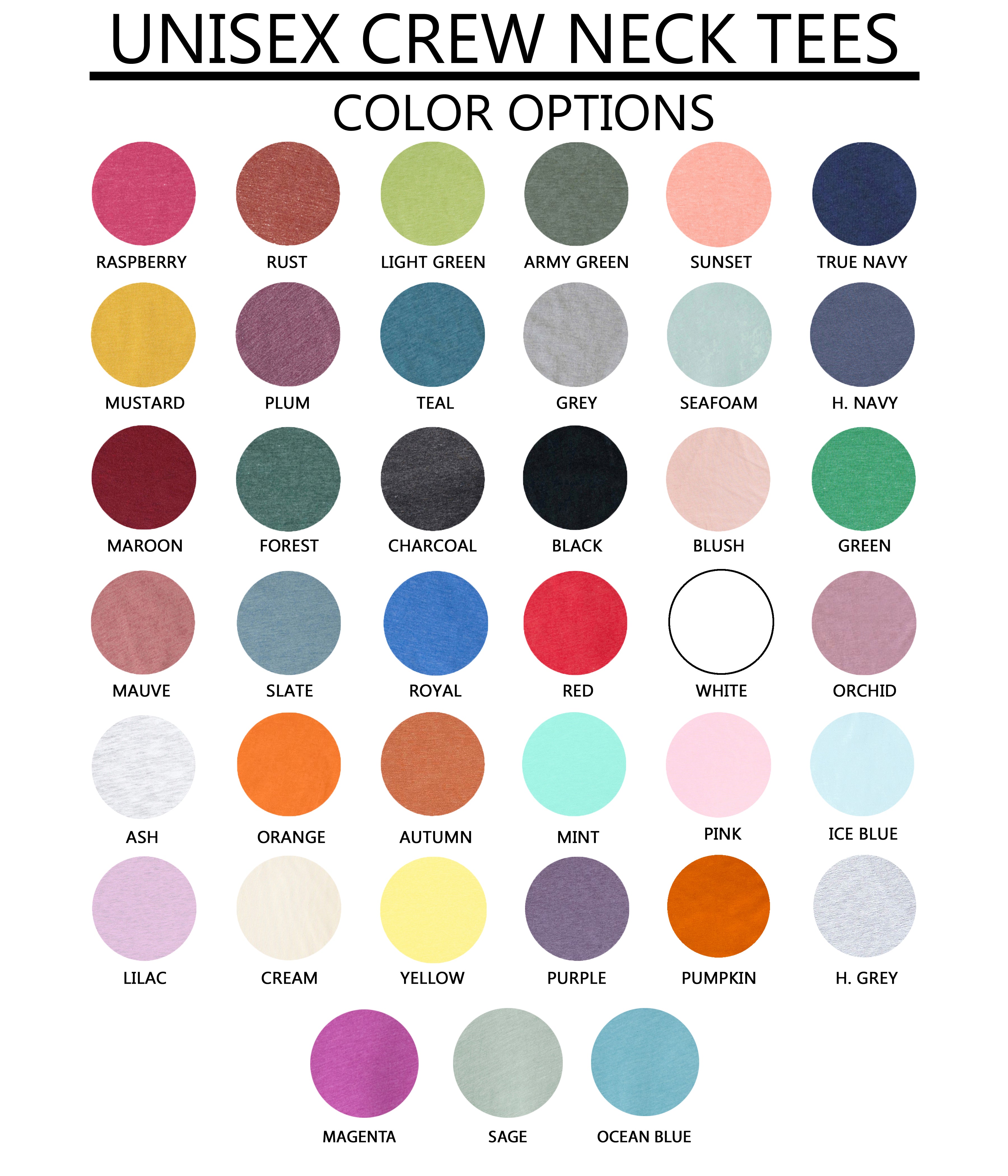 - Teal, Maroon, Heather Navy, Plum, Charcoal, Raspberry, Olive, Forest, Rust, Slate, Sunset, Seafoam, Mauve, Blush, Royal, Mustard, Orchid, Autumn: 52% Combed ringspun cotton, 48% Polyester