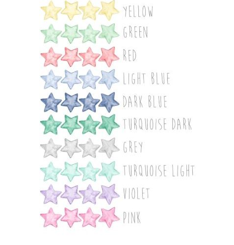 2 A4 size sheets of multicolour dots. 40 dots, each star about 55mm.(4 x turquoise, 4 x yellow, 4 x pink, 4 x turquoise, 4 x grey, 4 x light blue, 4 x red, 4 x dark blue, 4 x green, 4 x violet, 4 x turquoise dark.
