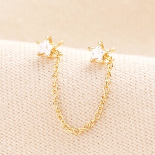 A gorgeous pair of double star chain crystal stud earringsMade to comfortably fit double piercings on the same earLightweight 14ct gold plated hypoallergenic sterling silverPerfect to add to a curated gold celestial jewellery rangeContains two connected studs that are suitable for a single ear with two piercingsDimensions: length 45mm star height 3mm x length 3mmMade from: 14ct gold plated sterling silver, cubic zirconia