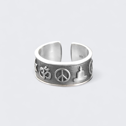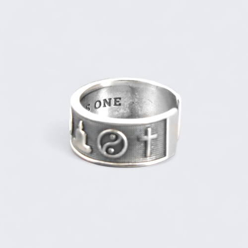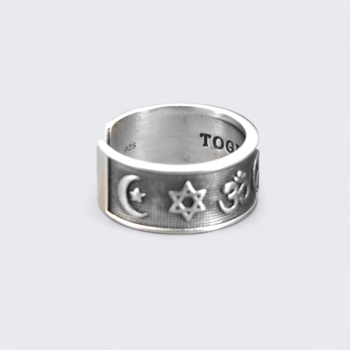 Celebrate unity through diversity with this symbolic sterling silver coexist ring. A wearable testament to peace and spiritual harmony, it brings together key icons from major world faiths and philosophies in one elegant design. With the word “Coexist” artfully formed from sacred symbols, this ring is more than jewelry-it’s a daily reminder of shared humanity.Key Features* Design: Features a symbolic “Coexist” layout: Crescent for Islam,, Star of David for Judaism, Om for Hinduism, Peace Sign for unity, Buddha silhouette for Buddhism, Yin Yang for Taoism, and Cross for Christianity* Adjustable Size: Adjustable from US ring sizes 6.5 to 9.5; band width is 0.5 inches* Material: Solid 925 sterling silver with oxidized background and polished symbols* Features: Interior engraving reads “Together As One”; open back for flexible fitThis ring makes a thoughtful gift for those who believe in harmony, practice interfaith respect, or simply want to wear a symbol of spiritual unity. Ideal for everyday wear, meditation, or as a peace-promoting statement piece.