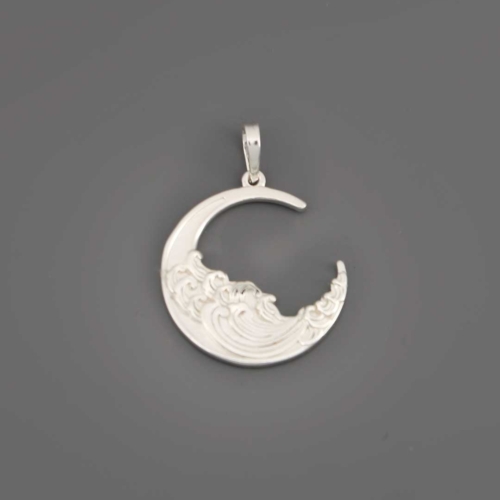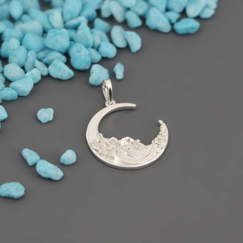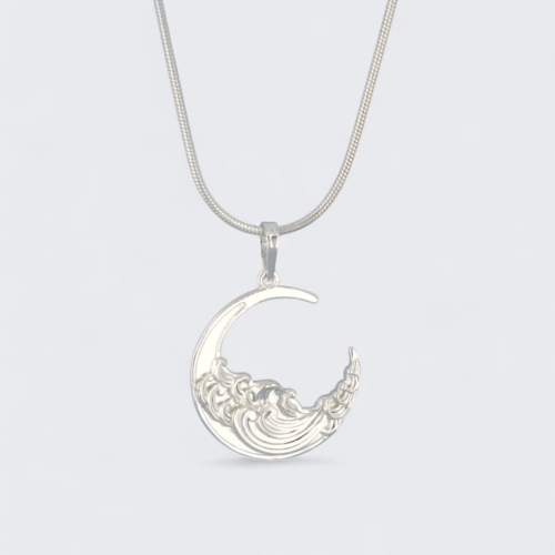 Inspired by the calming rhythm of the tides and the mystery of the moon, this crescent pendant blends celestial elegance with the power of nature. A smooth wave motif flows across the high polish surface, reminding us to trust our path and move with grace-even through uncertainty.🔍 Key Features:* Design: Stylized crescent moon adorned with sculpted wave detailing* Size: Measures 1″ wide x 0.875″ tall (plus bail)* Material: Sterling silver (925) with high-polish finish* Features: Embossed design for symbolic depth and elegant wearability* Sold as a pendant. The chain is sold separately.Wear this pendant as a personal reminder to flow with the rhythms of your life. Whether gifted or worn close to your heart, it channels calm, intuition, and feminine energy.