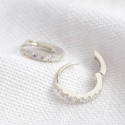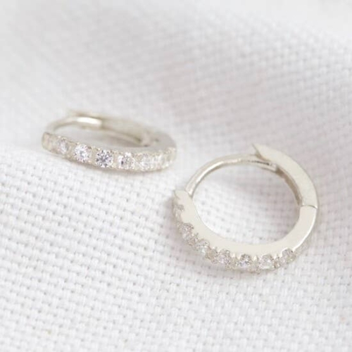 These sterling silver earrings feature a slim band design studded with glittering cubic zirconia crystals. Hypoallergenic and lightweight, these hoops are comfortable to wear, and easy to secure with their latch click fastenings.Dimensionsouter width – 11mminner width – 7mmheight – 10mmMade fromsterling silver, cubic zirconia crystals