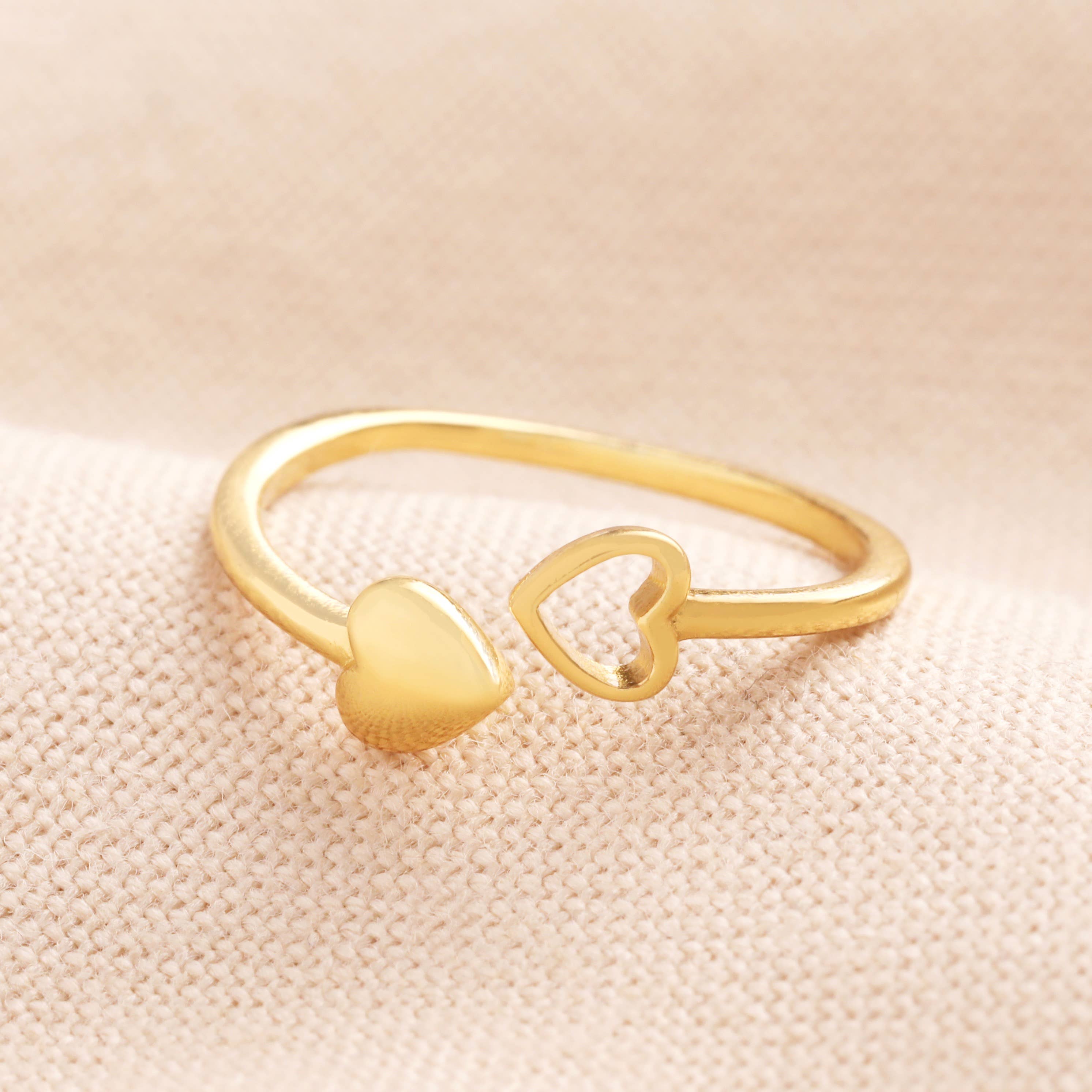 A sweet gold plated sterling silver ring with two connected heartsWith an adjustable open front to comfortably fit any ring sizeFeatures a unique heart shape, ideal for lovers of romantic stylingA great gift for customers who love understated gold accessoriesDimensions: adjustable UK ring size PMade from: sterling silver, gold plating