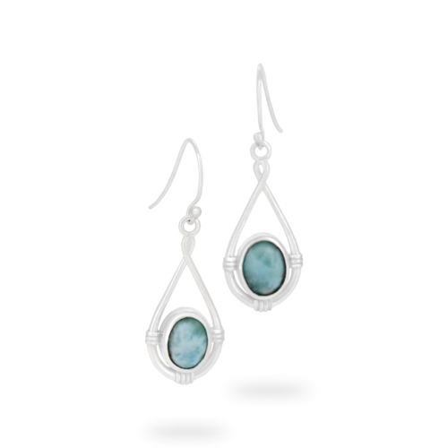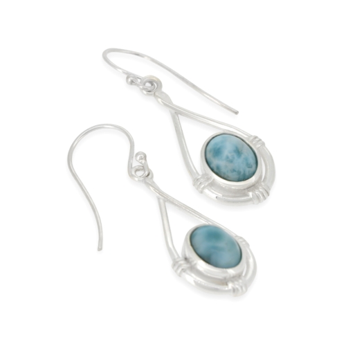 Dive into the tranquil allure of these sterling silver larimar earrings, featuring a teardrop-shaped twist design frame that gracefully embraces the soothing blue hues of the larimar gemstones. Larimar is believed to promote relaxation, emotional healing, and inner peace, making these earrings a meaningful addition to your jewelry collection. Exquisite larimar gemstone earrings set in high-quality sterling silver Oval-shaped larimar gemstones exhibit captivating blue tones and natural beauty The earrings measure about 1″ long + hook; 0.5″ wide The gemstone frame is about 8 mm wide and 12 mm long Teardrop-shaped twist design frame adds a layer of elegance and sophistication Comfortable hook ear wires for easy wear